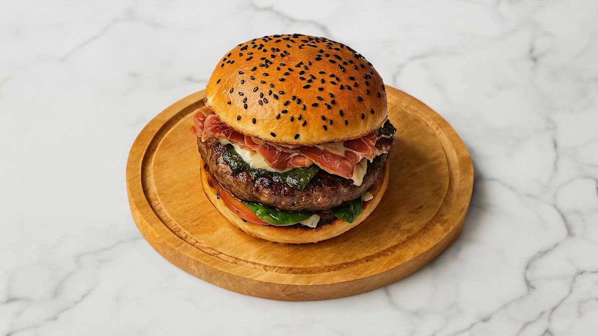 200g signature angus beef patty, toasted brioche bun, mozzarella di bufola, parma ham, grana shavings, fresh basil pesto and tomatoes