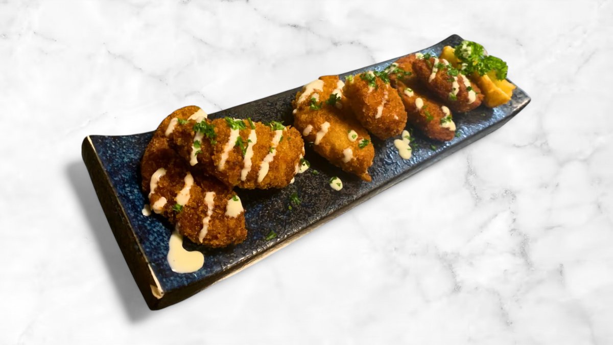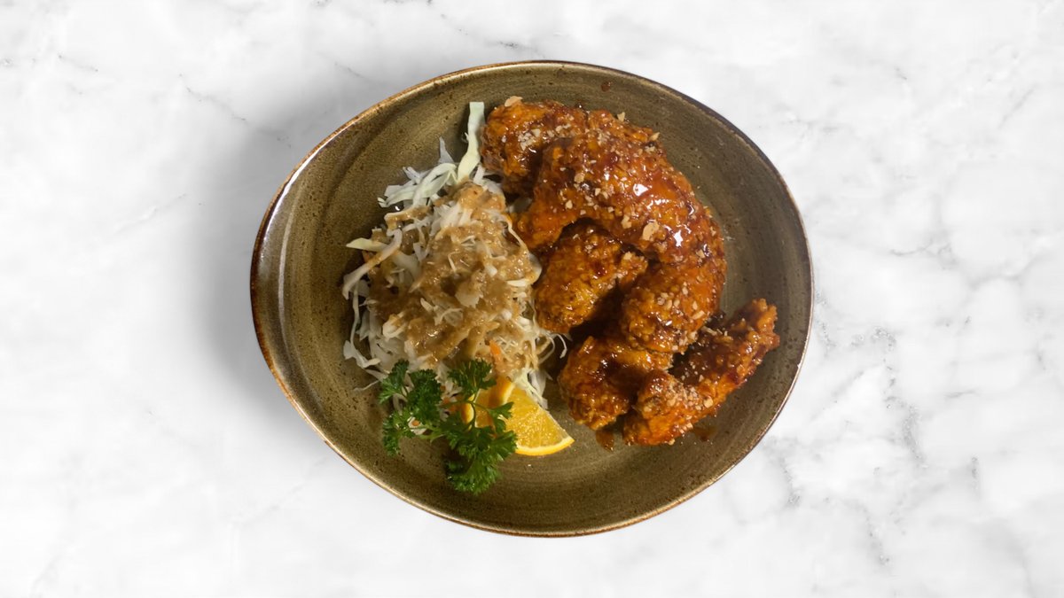 5 pieces of vegetable dumplings, vegetables, egg, nori and garlic