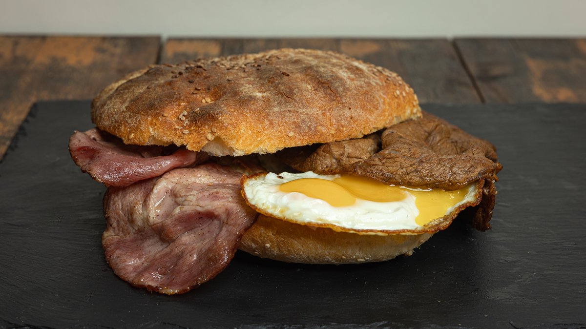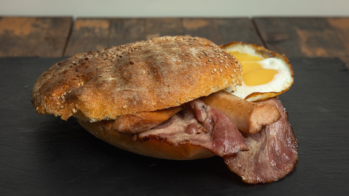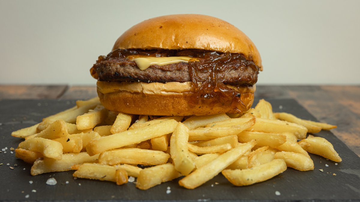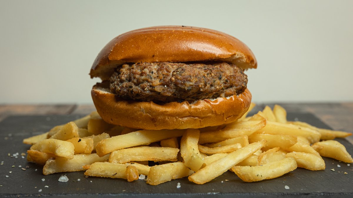 Burger made with maltese sausage and pork mince served with honey mustard and chips