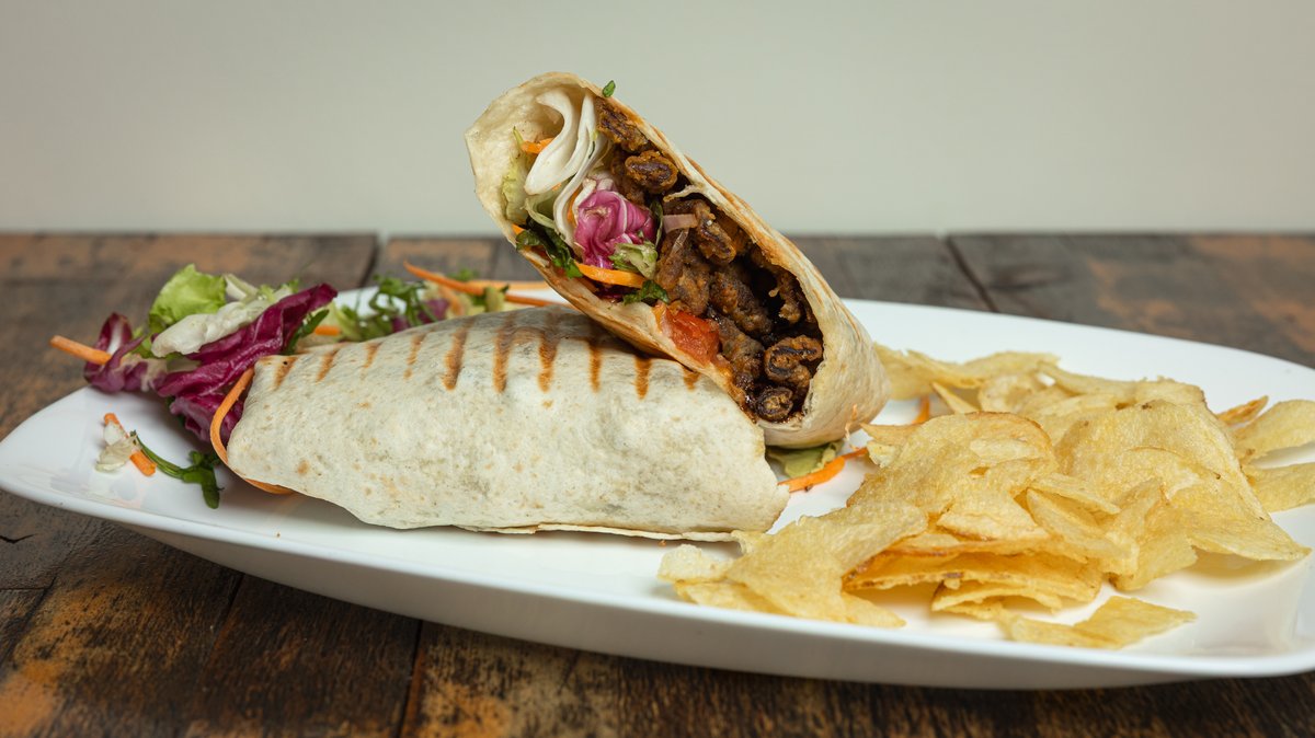 Beef strips with balsamic dressing, onions, tomatoes, shredded carrots and lettuce served with crisps and salad