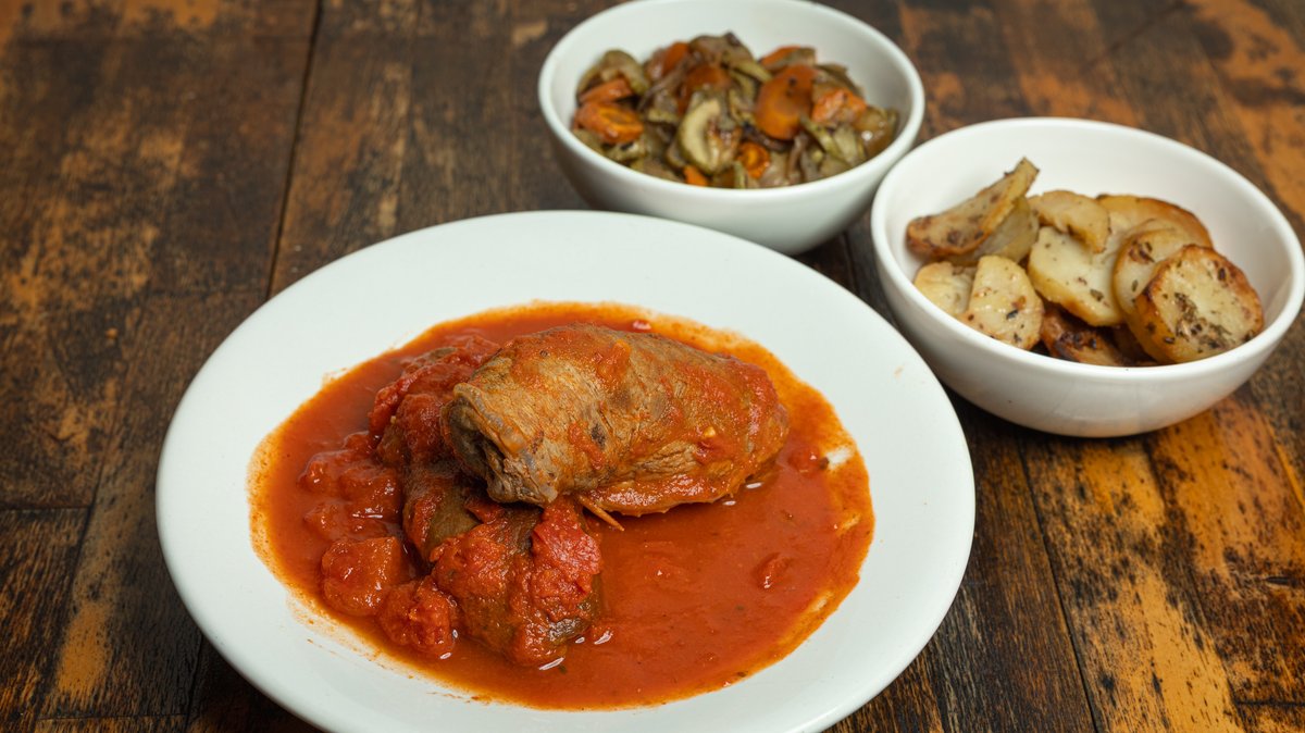 Traditional beef olives filled with minced meat and egg served with baked potaotes and sesonal vegetables