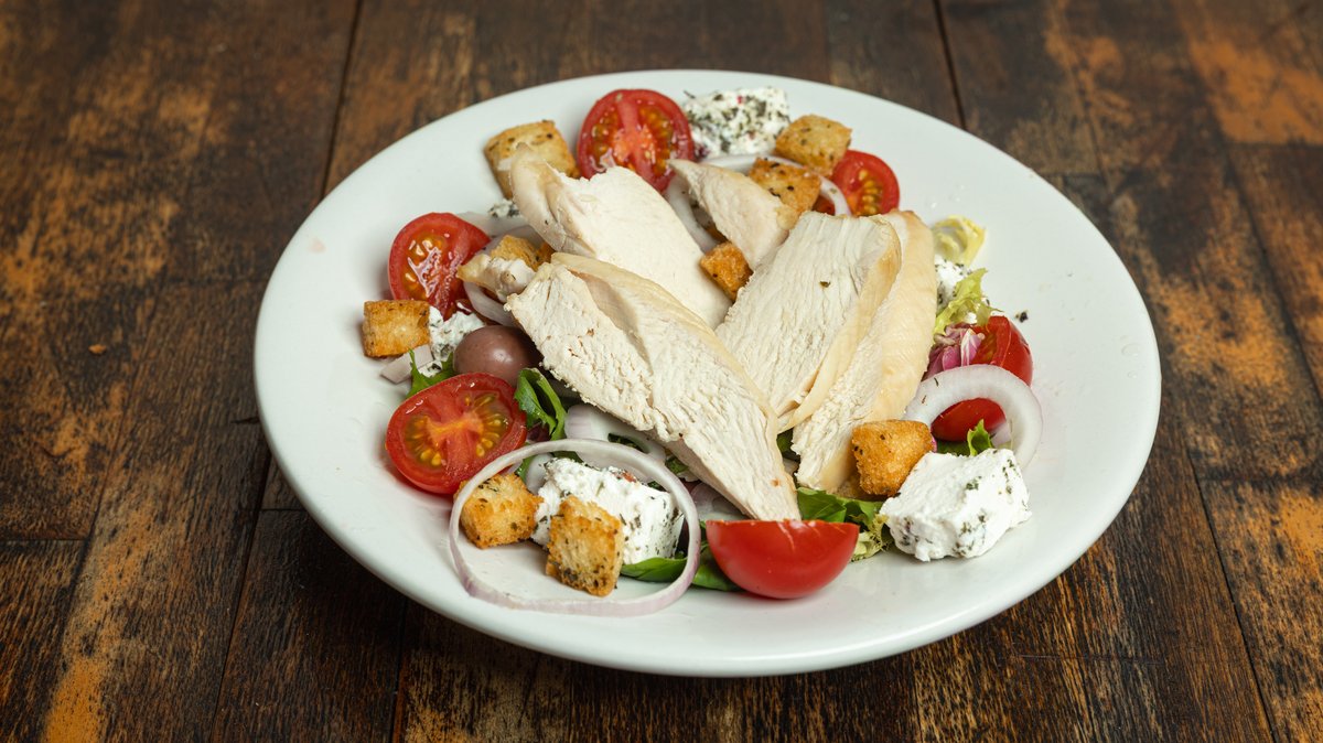 Chicken breast with lemon seasoning served on a fresh salad with tomatoes, red onions, black olives feta cheese and herbed croutons