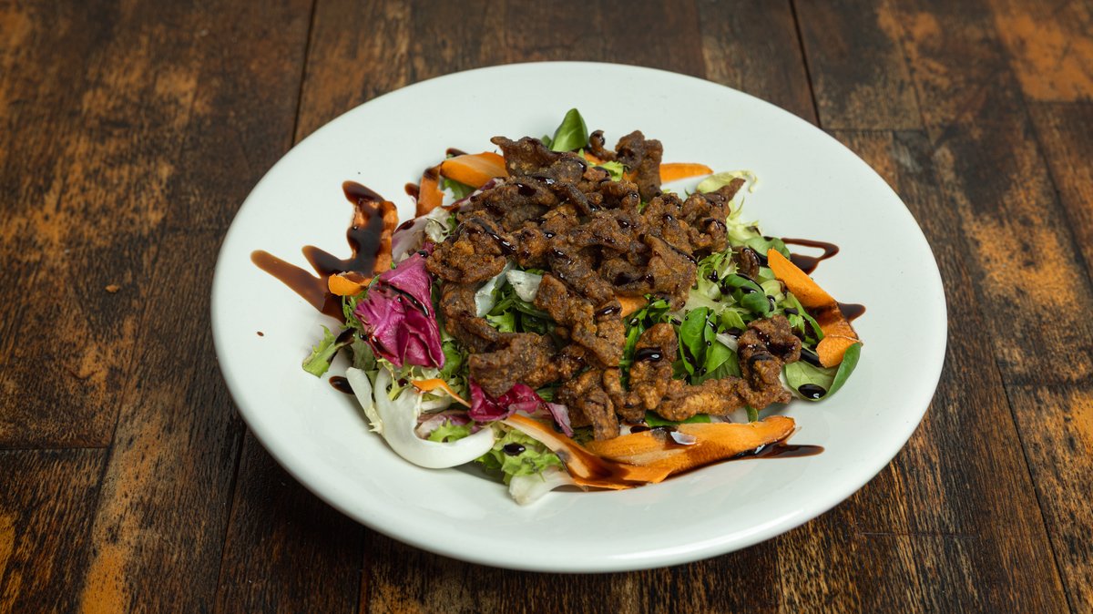 Beef strips with balsamic dressing served on fresh salad with tomatoes and shredded carrots