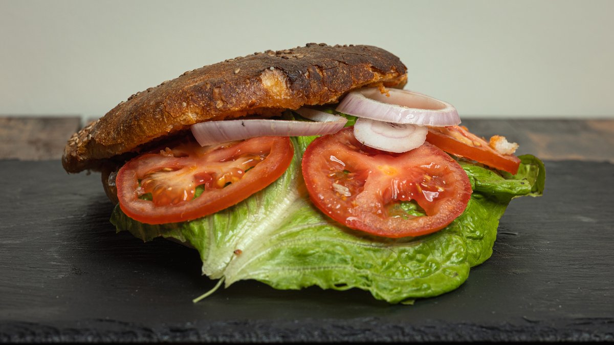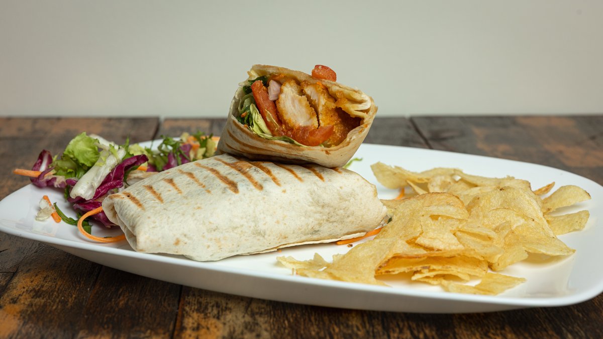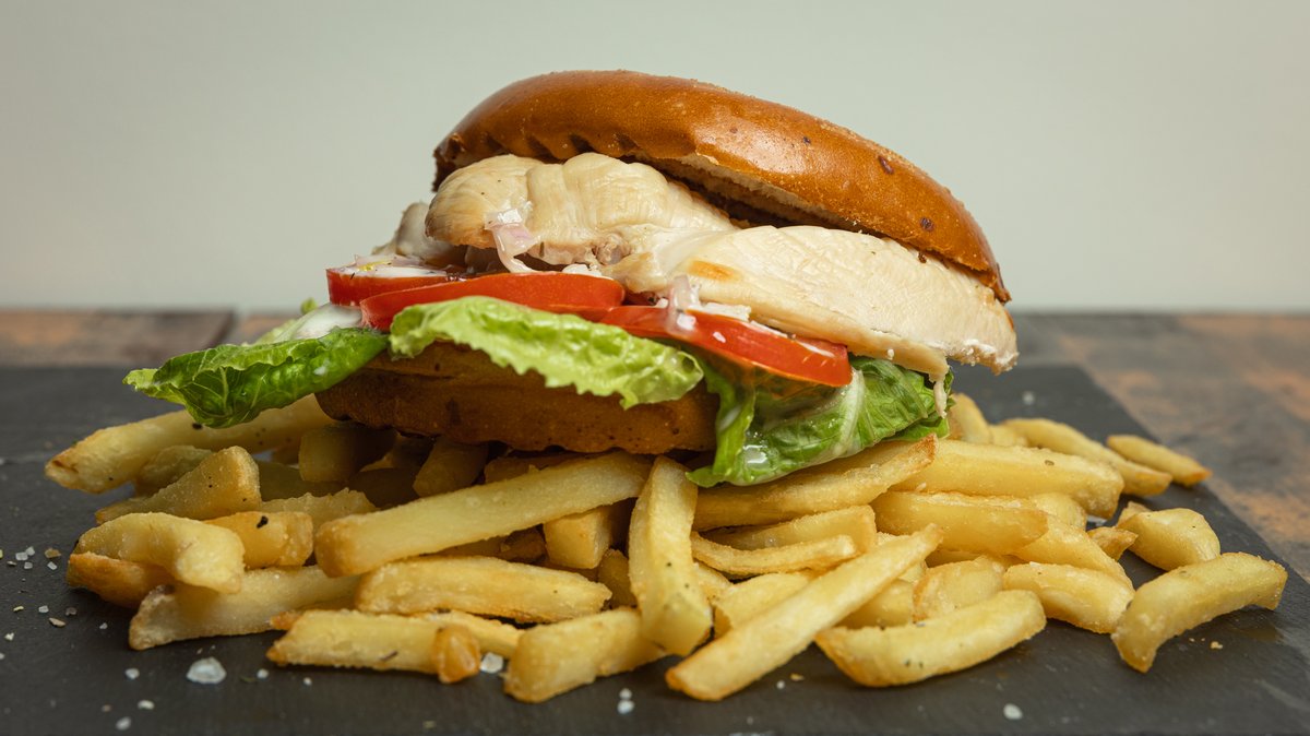 Chicken breast with lemon and pepper seasoning, tomatoes, lettuce, onions and herbal mayo served with crisps and salad