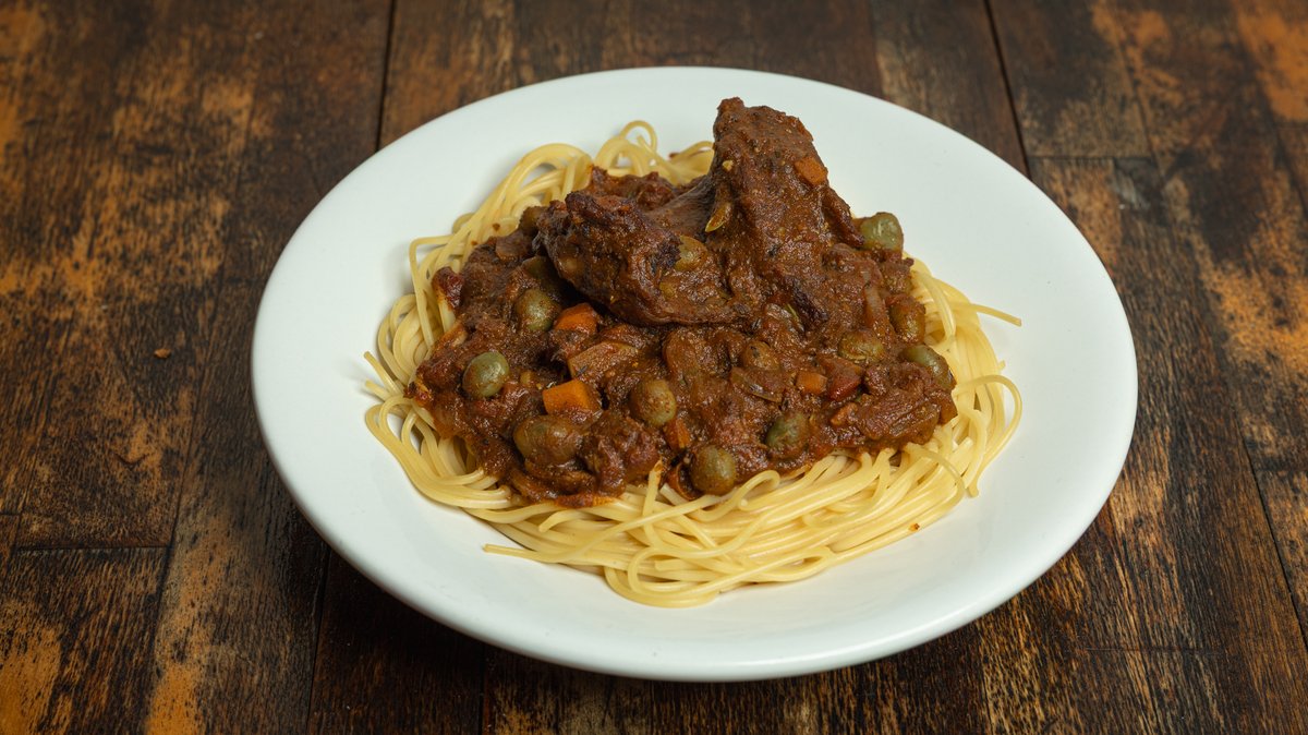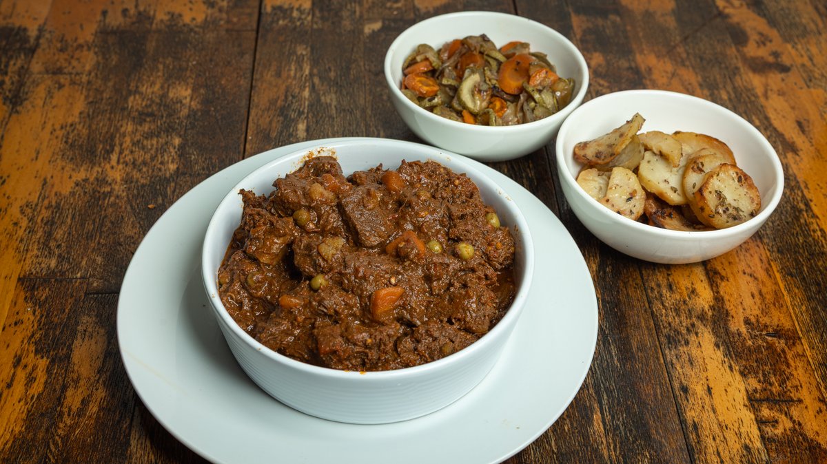 Traditional horse stew served with baked potatoes and sesonal vegetables