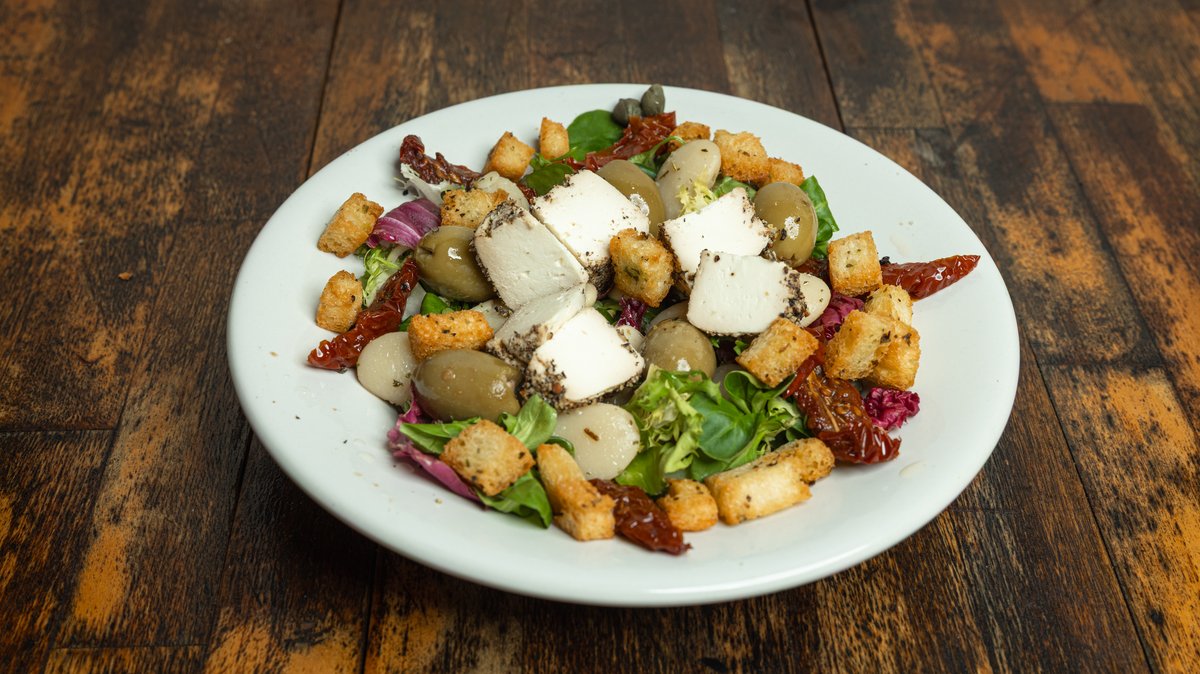Sliced maltese cheeslets with sundried tomatoes, capers butter beans and stuffed olives served on fresh salad dressed in herbal oil and toasted maltese bread