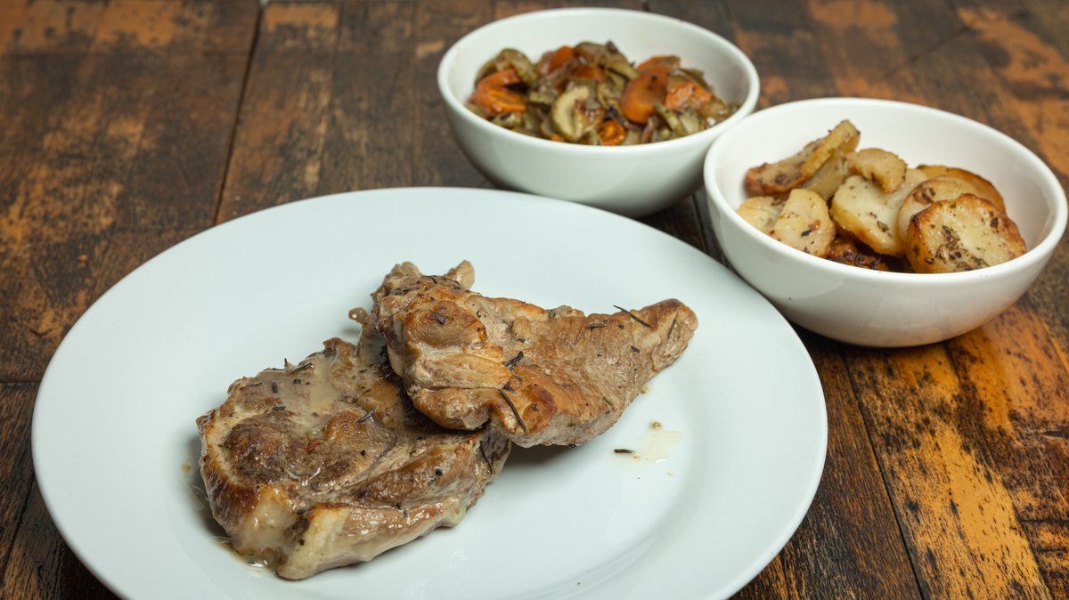 Baked pork collar served with baked potatoes and seasonal vegetables