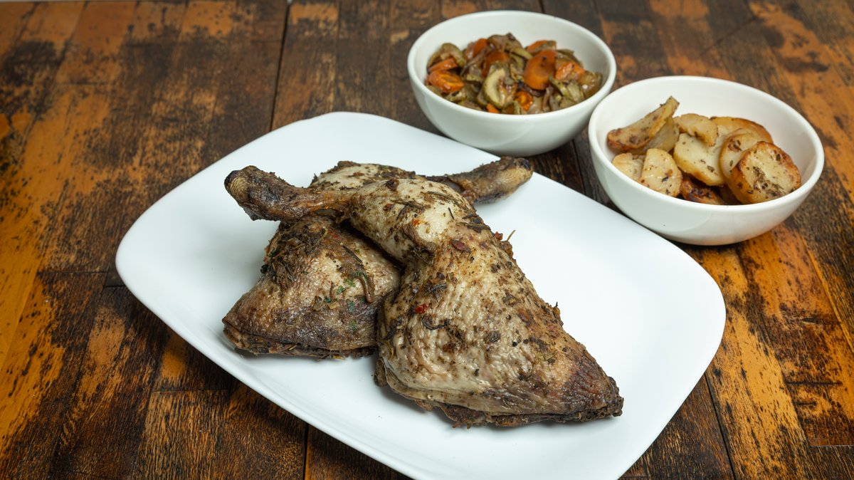 Oven baked chicken served with baked potatoes and seasonal vegetables