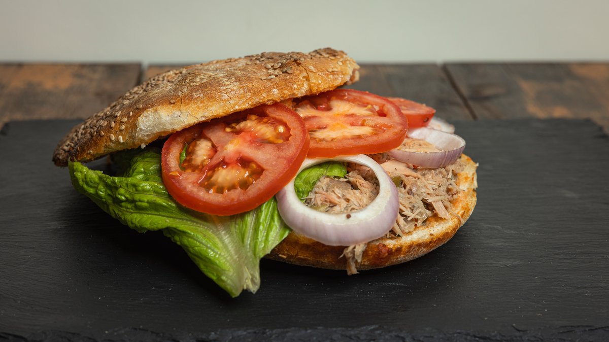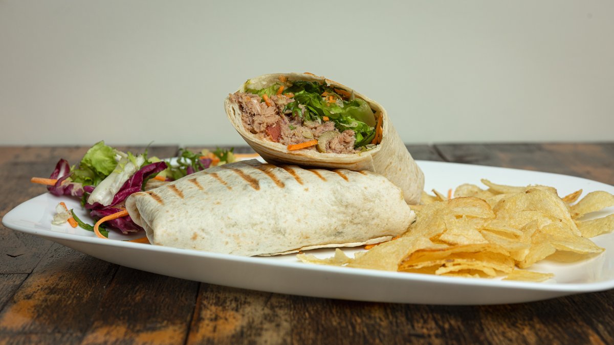 Tuna flakes, tomatoes, olives and lettuce with mayo served with crisps and salad