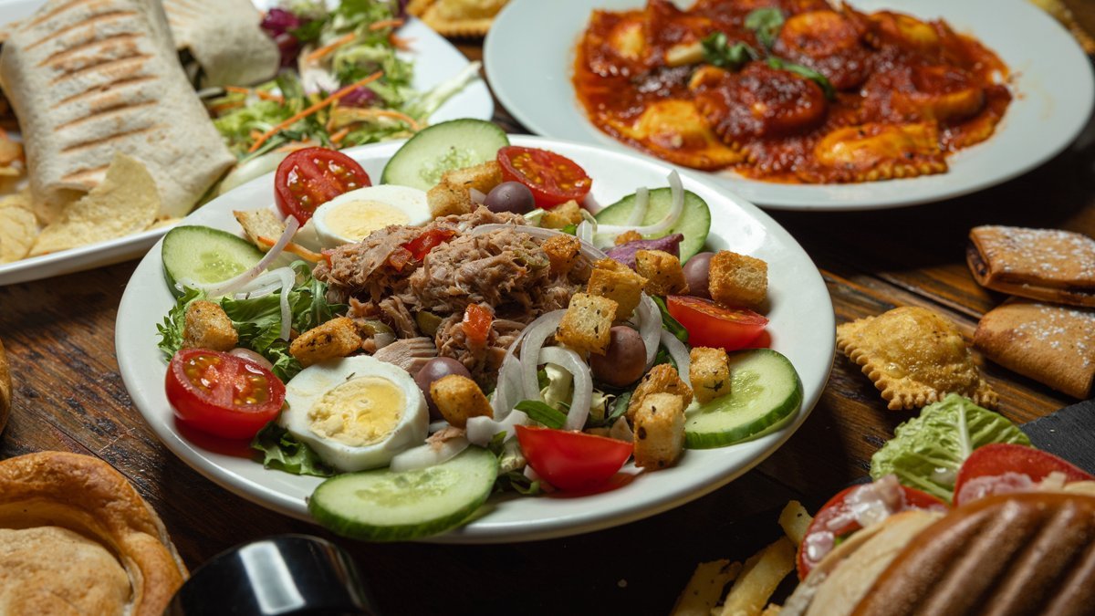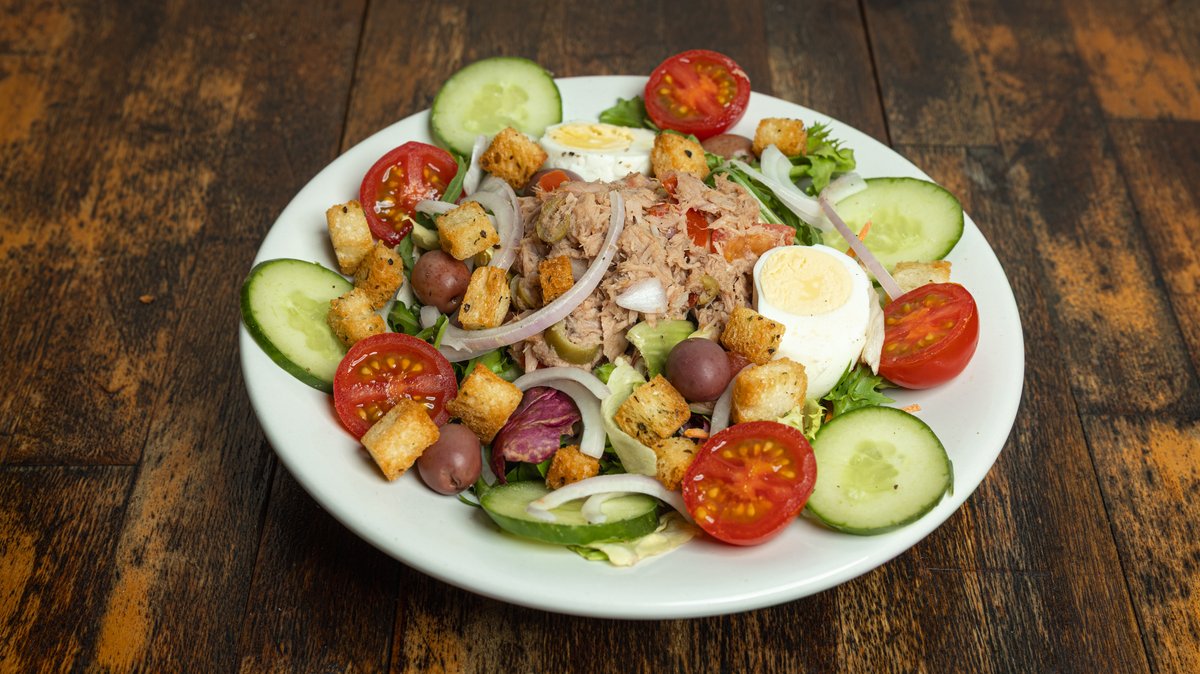 Tuna flakes, boiled egg, cucumber, tomatoes, onions and black olives served on a fresh salad and herbal croutons