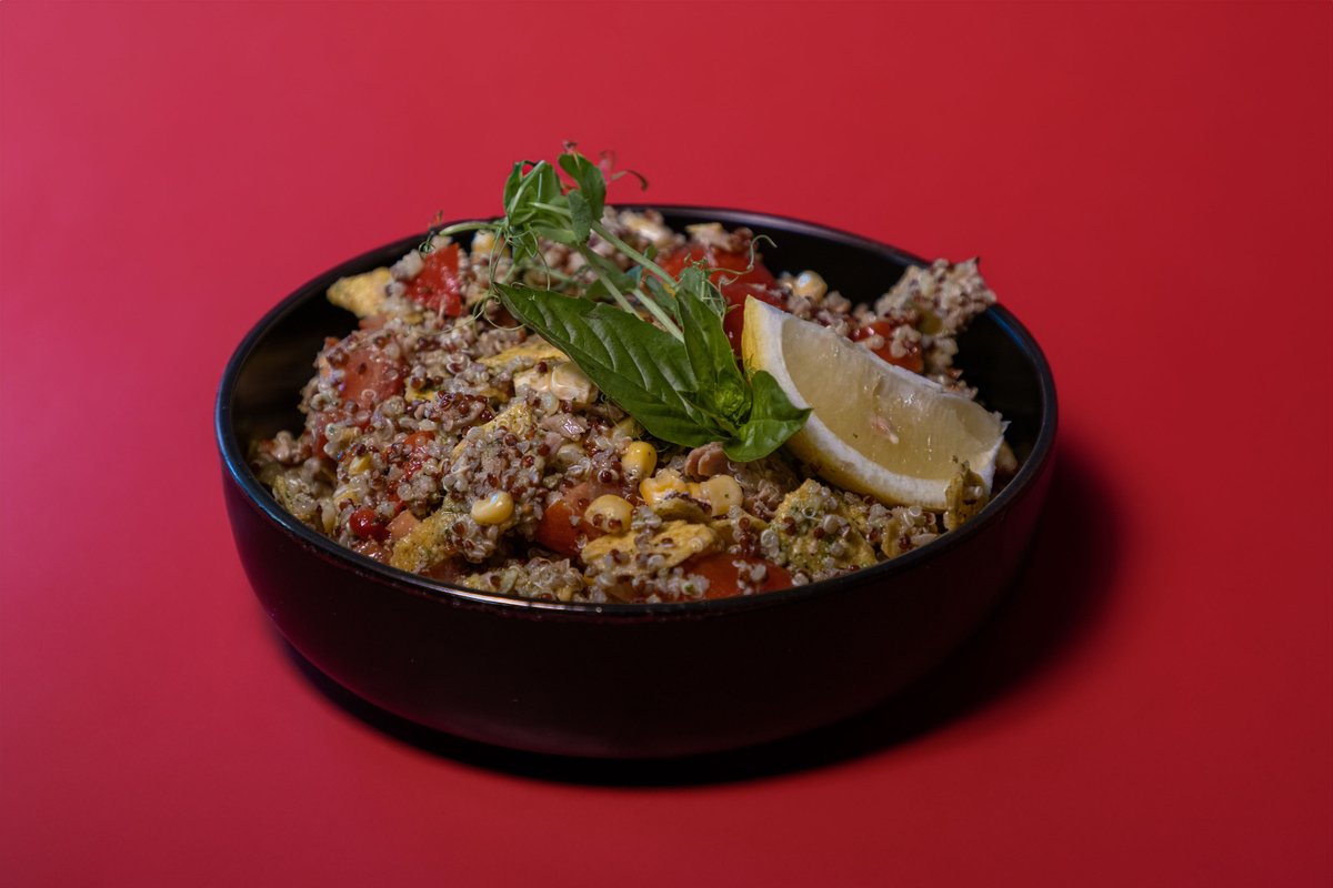 Quinoa tuna, sweet corn, cherry tomatoes, baby spinach, roasted bell peppers, basil pesto citrus dressing and nacho crumbs