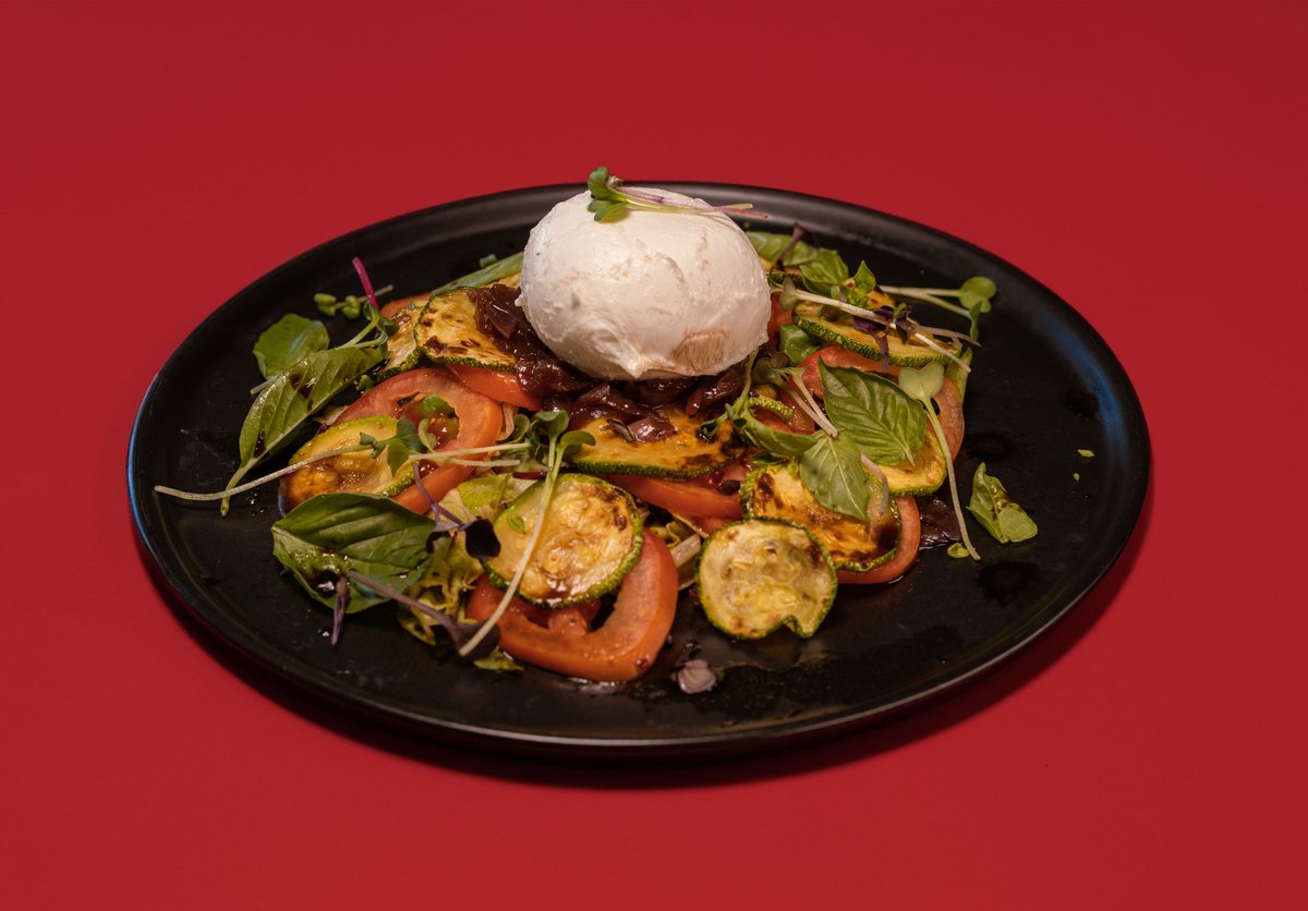 Zucchini, tomato, red onons, balsamic vinaigrette and basil leaves