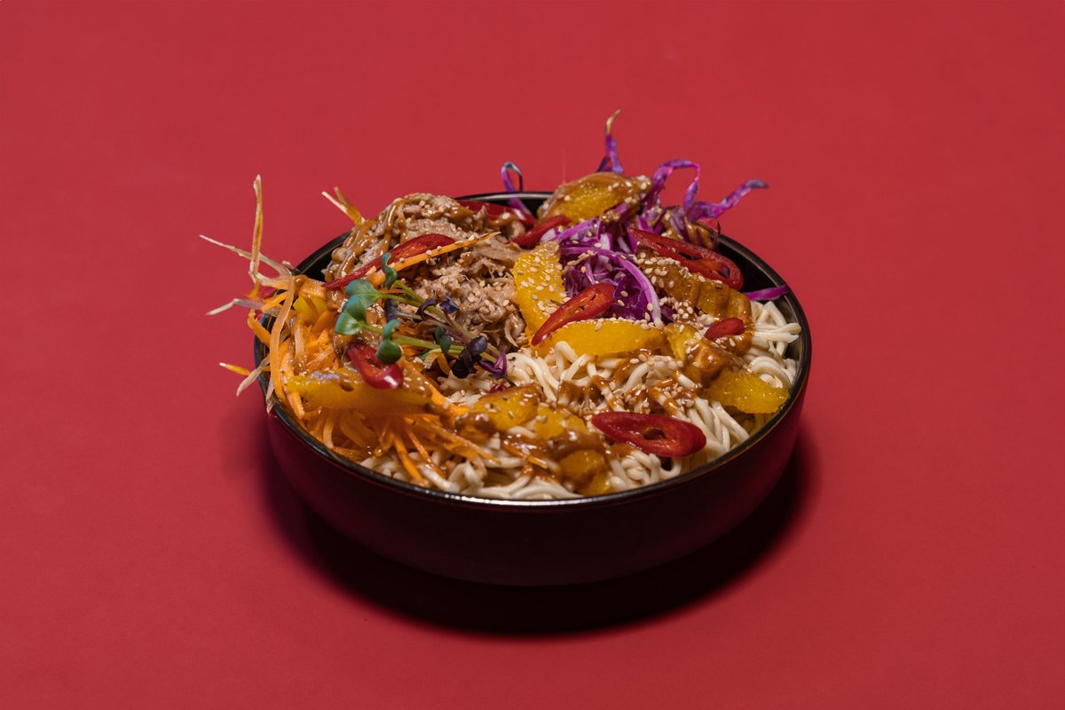Pulled duck egg noodles, carrots, orange segments, red cabbage, sesame seeds, red chilies and peanut butter dressing