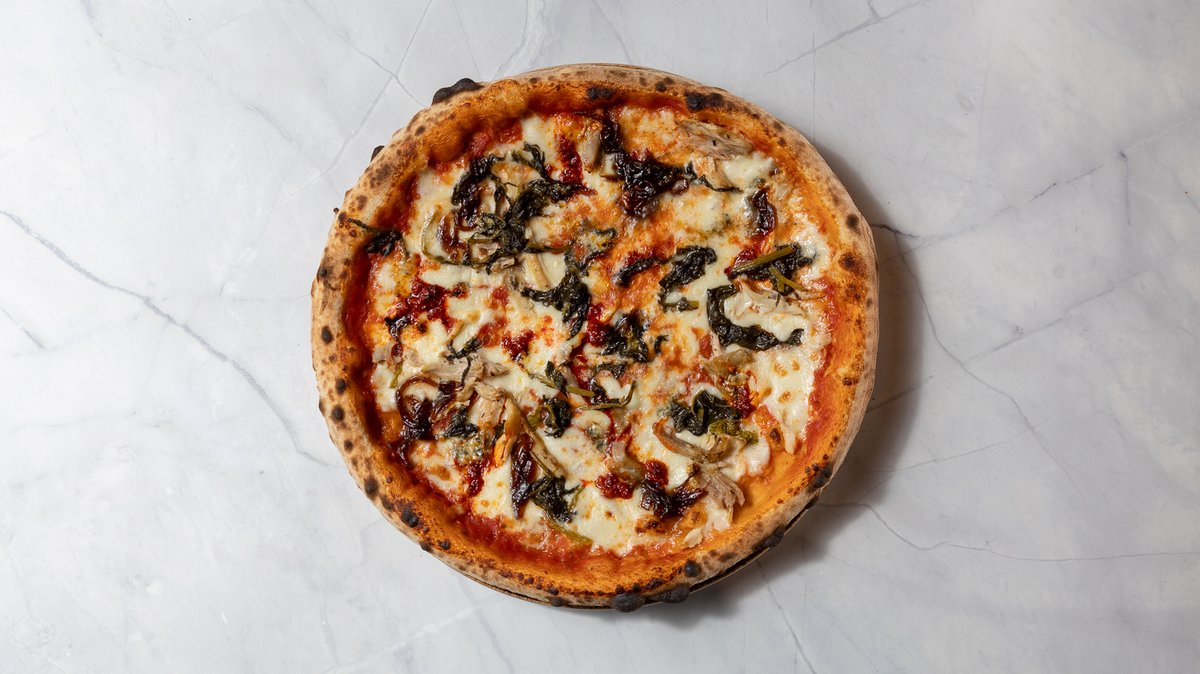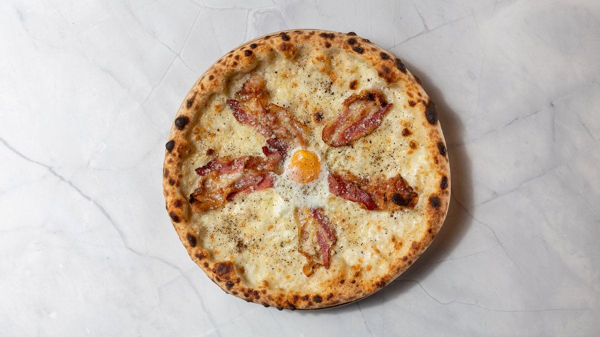 Tomato sauce, mozzarella fior di latte, roast ham, mushrooms, artichokes, egg, black olives, oregano and olive oil