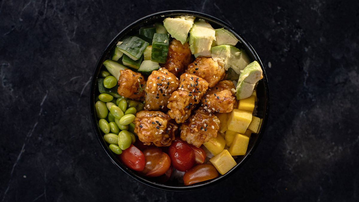 Sushi rice, fried salmon, avocado, cucumber, edamame, cherry tomatoes, mango, sweet mayonnaise and thai dressing