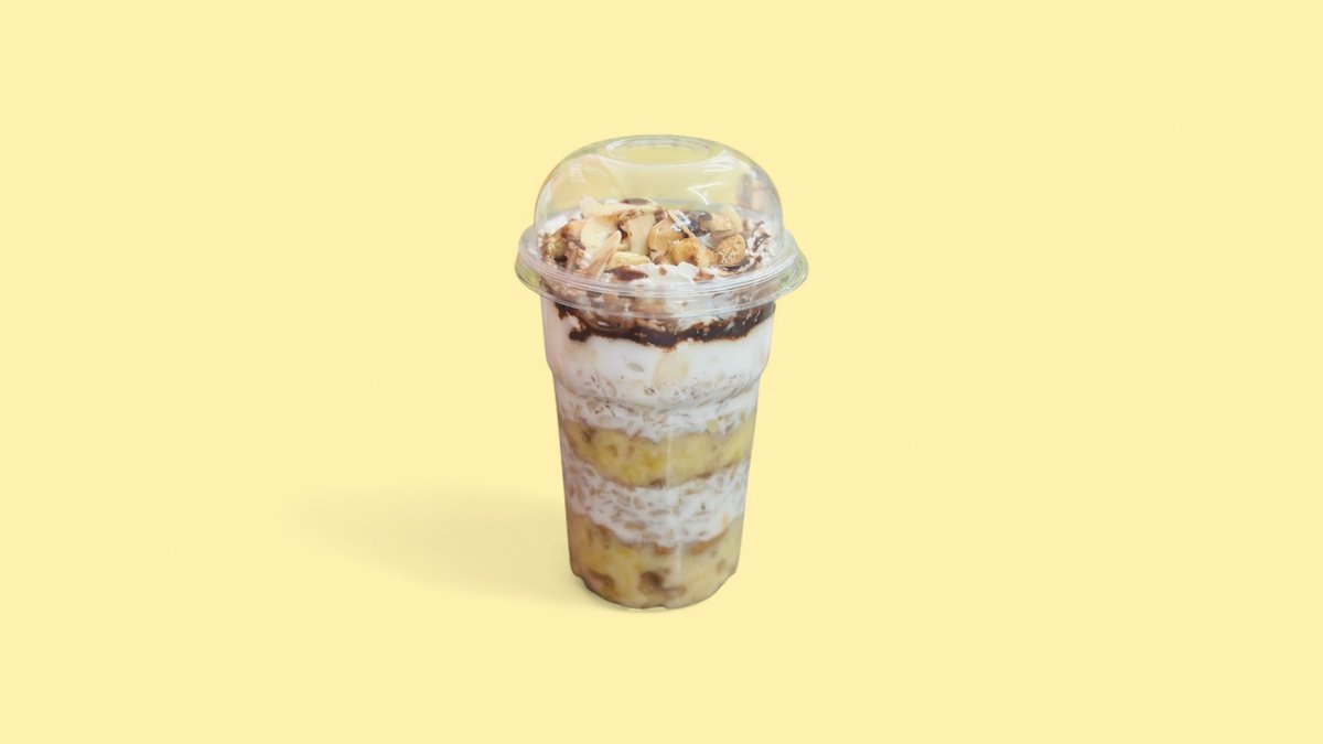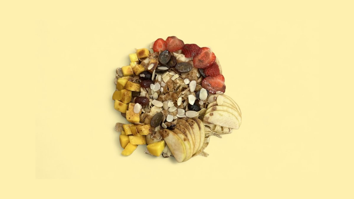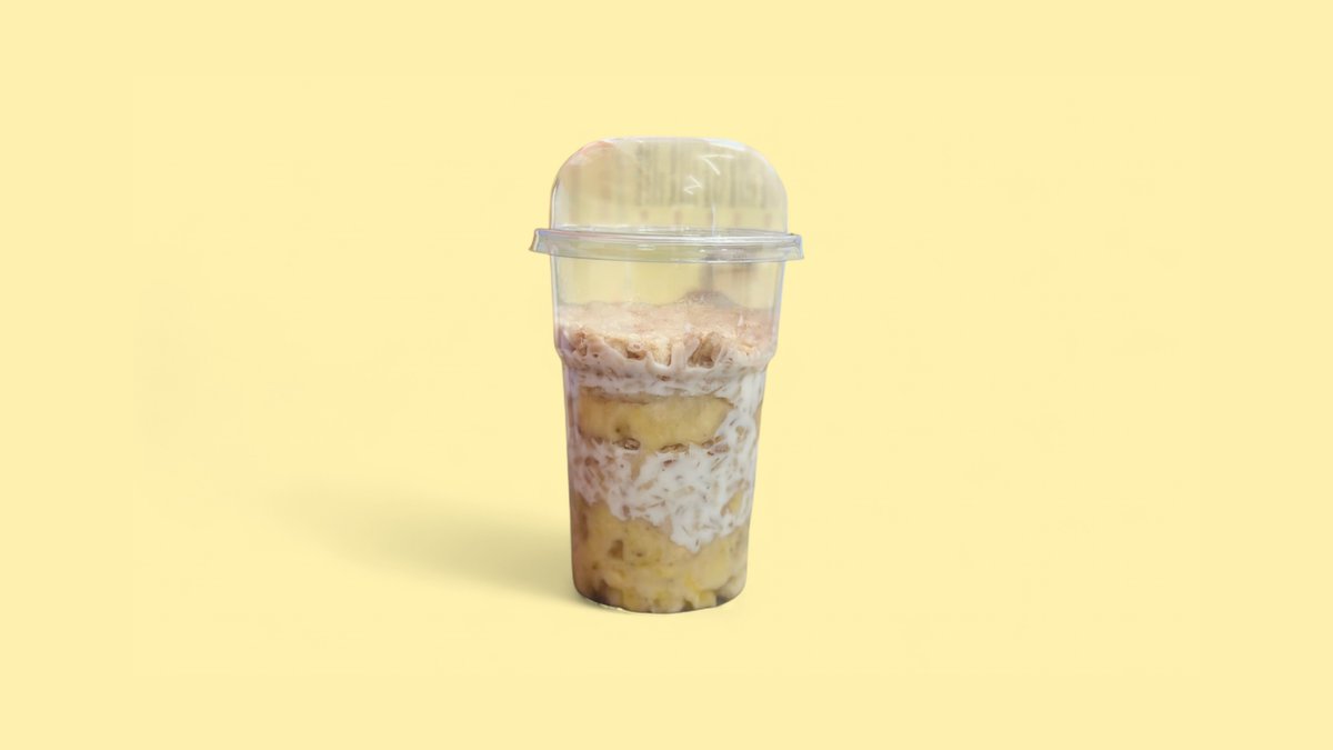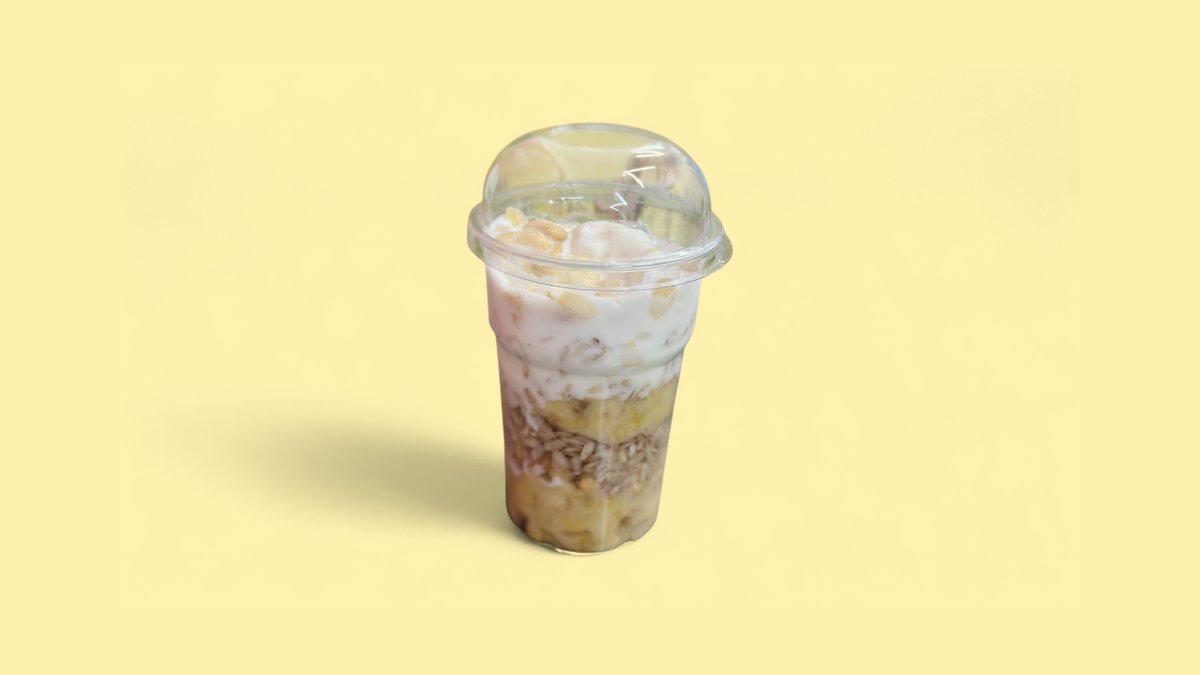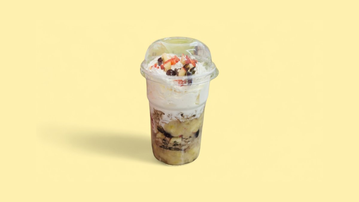 Milk, oats, banana, apple, grapes, strawberry ice cream and cuscus