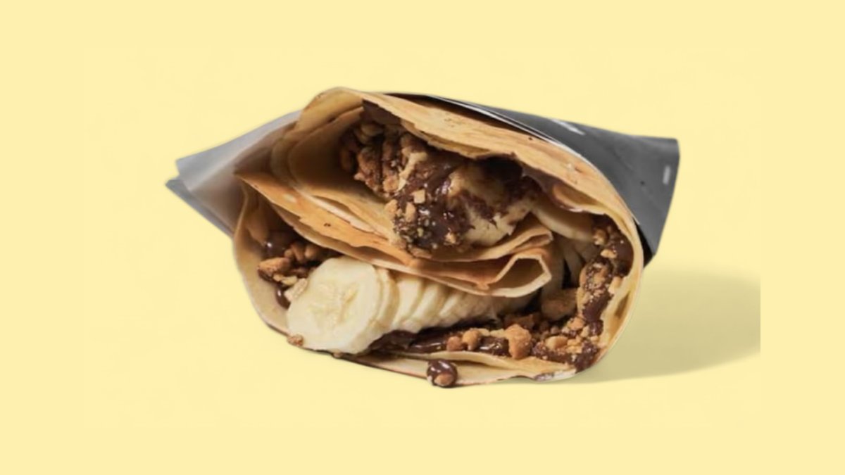 Fresh banana slices, chocolate sauce, and crunchy nuts wrapped in a warm crepe