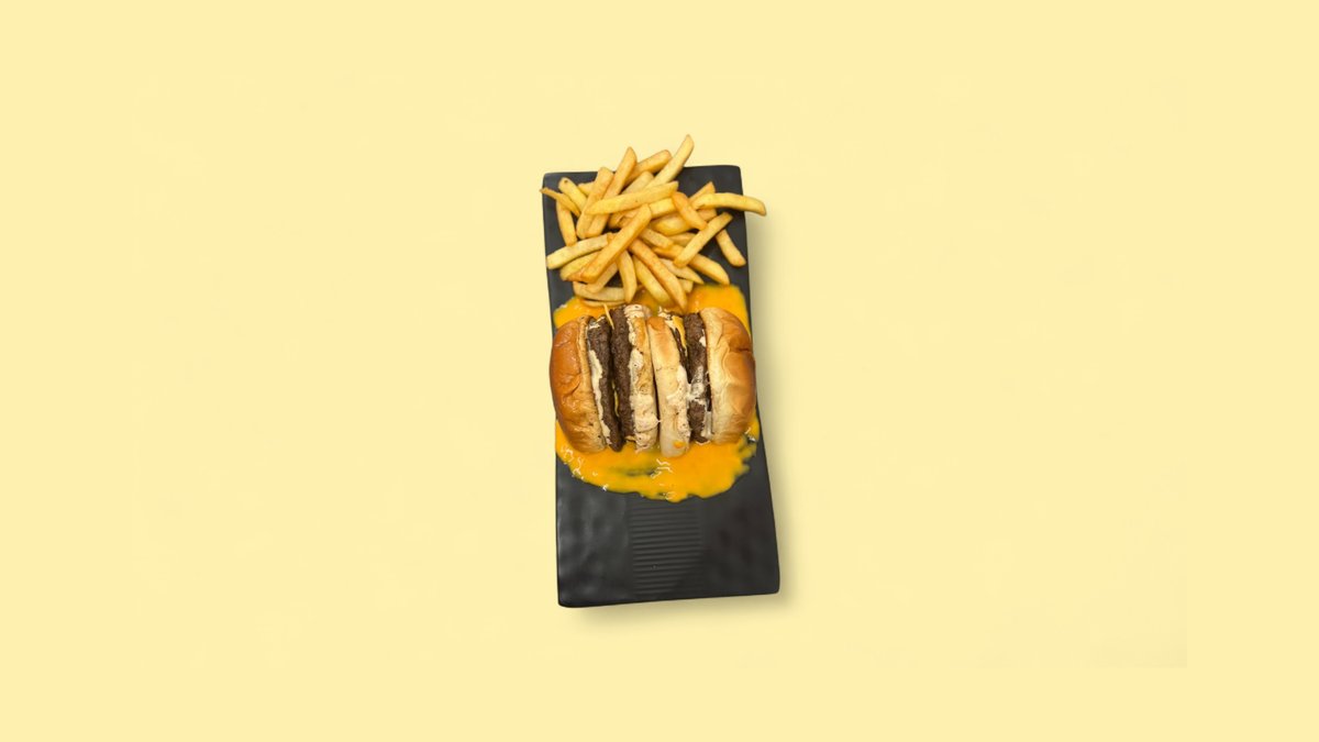 Two beef patties with melted cheese, sliced in half and seared cut-side down for extra flavor. Served on a flaky brioche bun with butter. Crispy fried potatoes for perfect side.