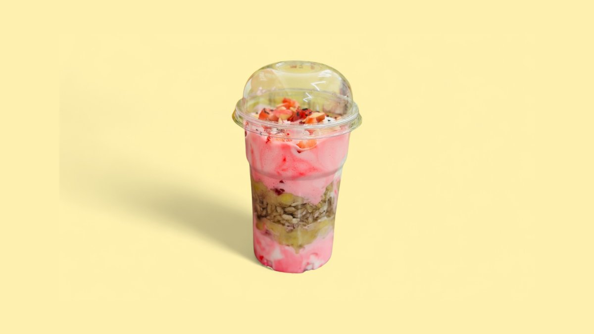 Milk, oats, banana, apple, vermicillion, cuscus, strawberry ice cream and honey
