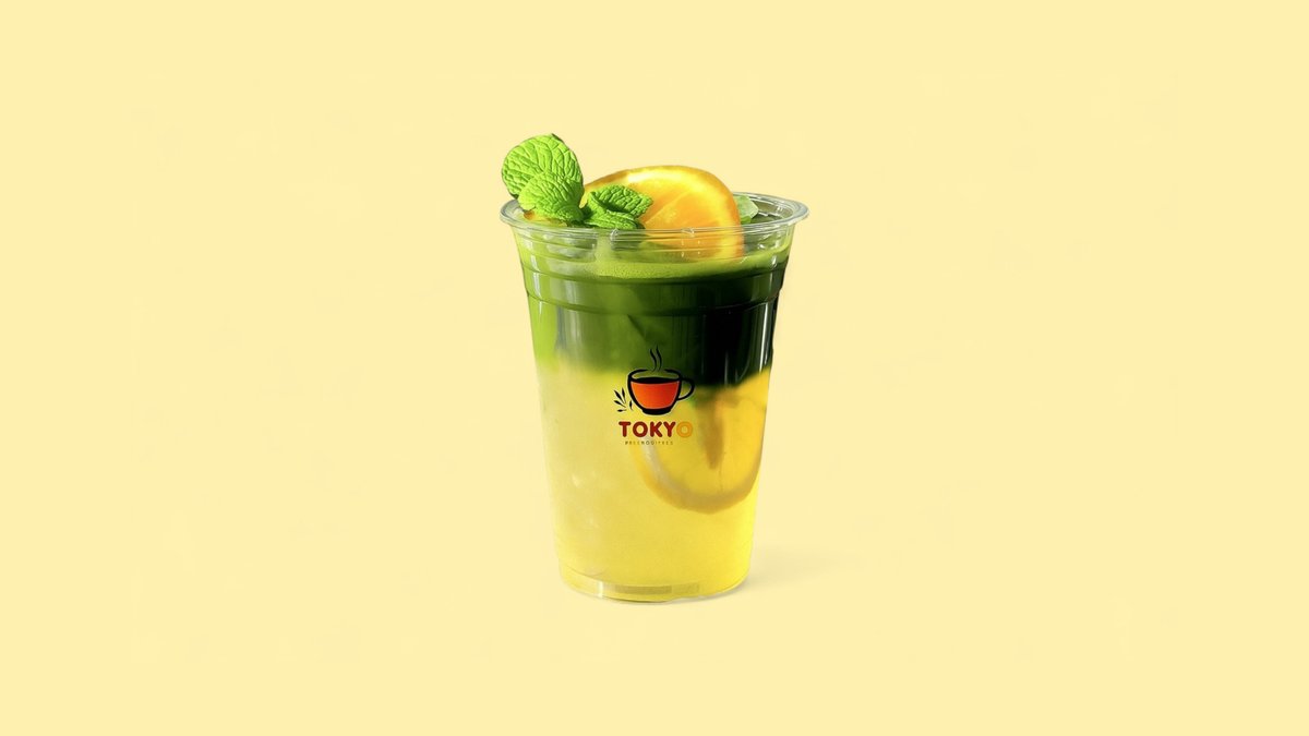 Honey, iced lemon, matcha, lemon slices, and mint.