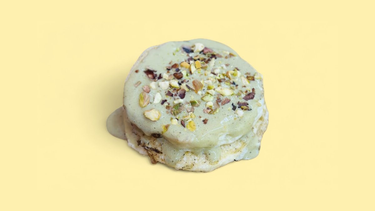 Japanese souffle pancake topped with pistachio cream and pistachios.
