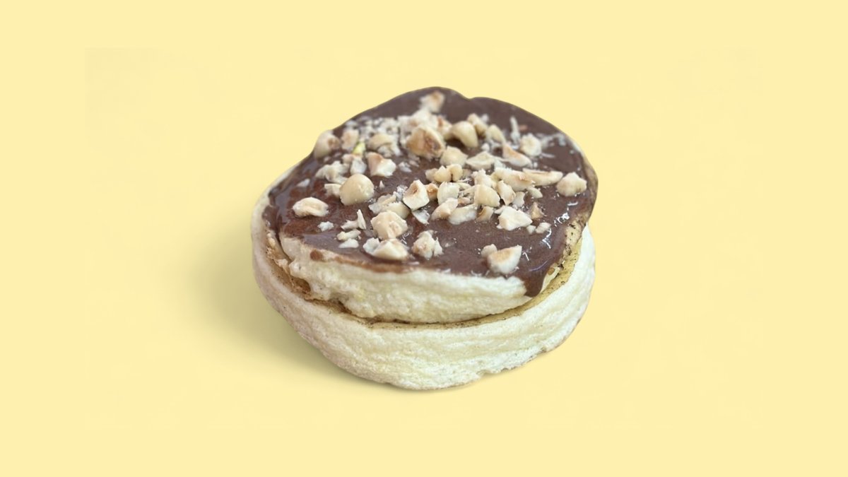 Japanese souffle pancake topped with Milk chocolate and hazelnuts.