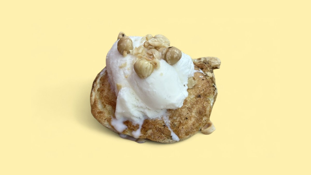 Japanese souffle pancake topped with vannila icecream and hazelnuts