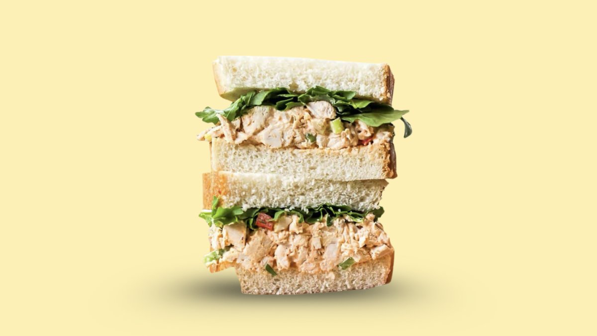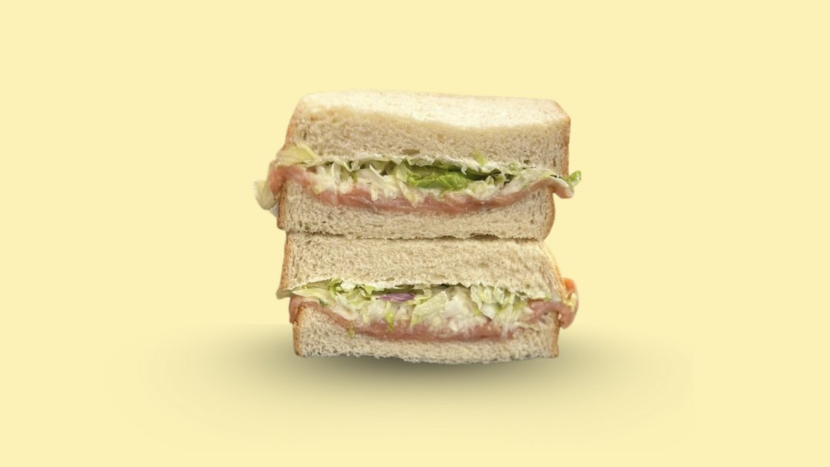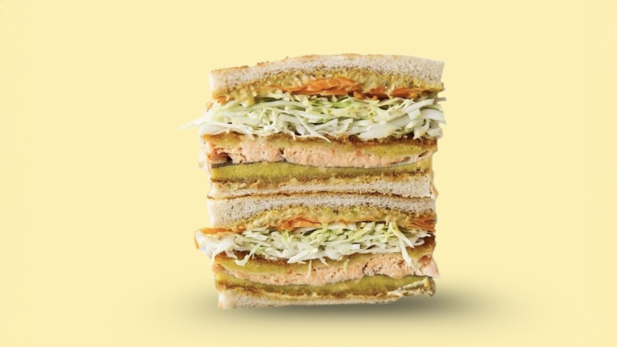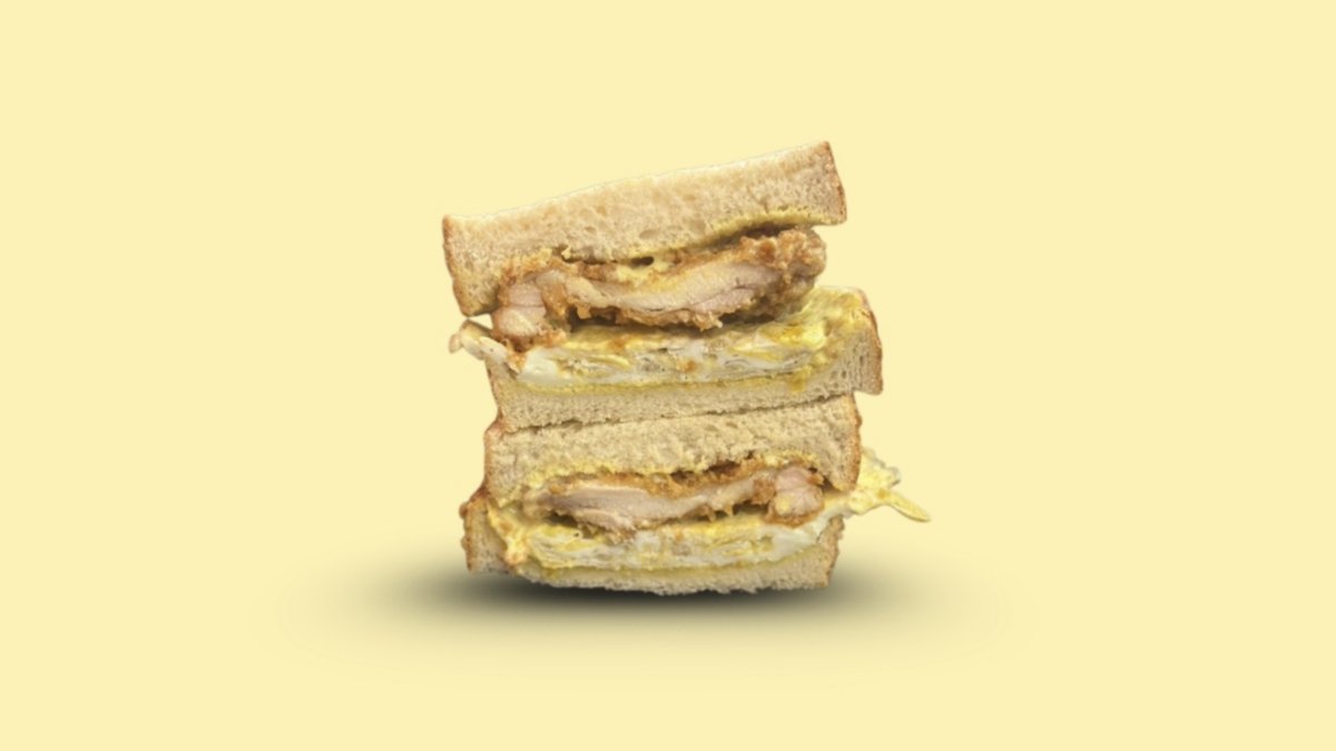 A japanese - style egg sandwich with thick, fluffy tamagoyaki (sweet omelet) and chicken karaage layered between milk bread and complemented with a creamy mayo-mustard blend