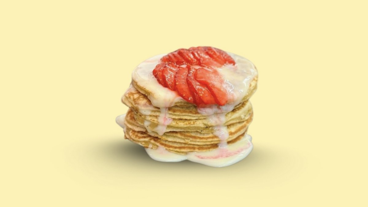 Japanese souffle pancake topped with white chocolate cheese and strawberries