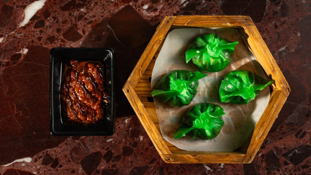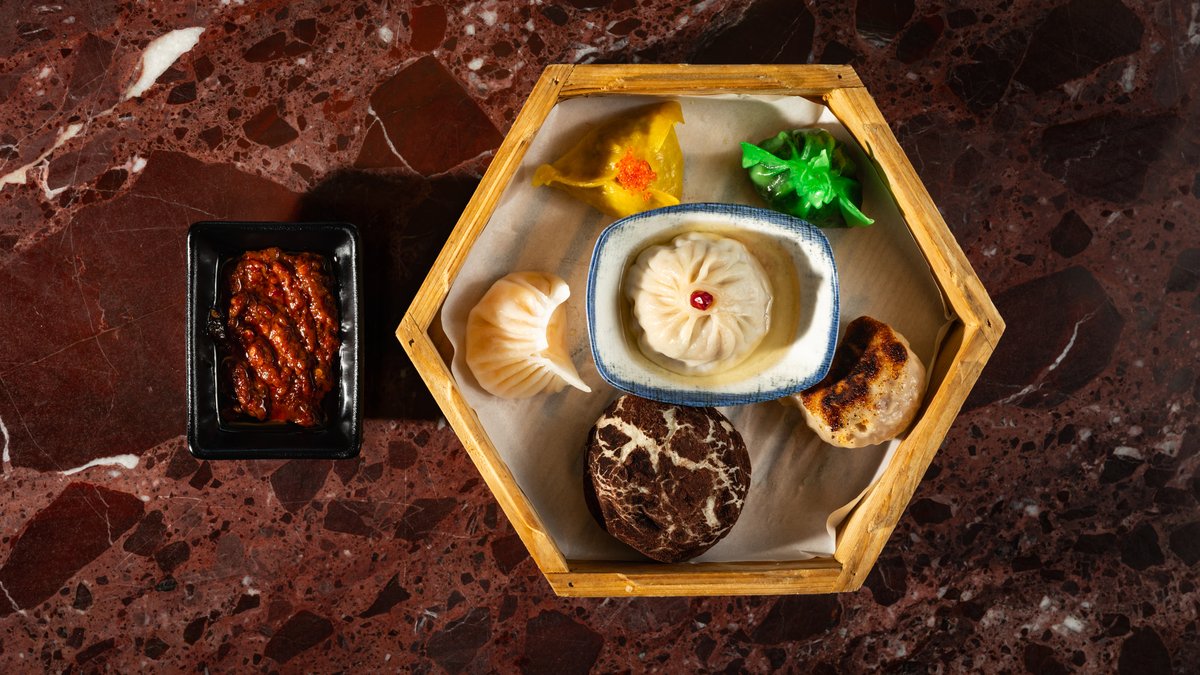 Chef selection of 6 steamed dim sum xiao long bao, morel mushroom bun, crystal dumpling, gyozas lace dumpling, pork bun, Chilean seabass dumpling