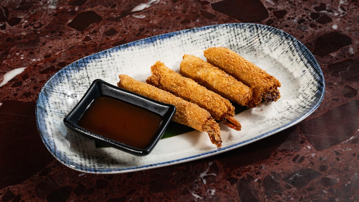 Prawns wrapped in feuillet de brick pastry with a chilli and lime dressing