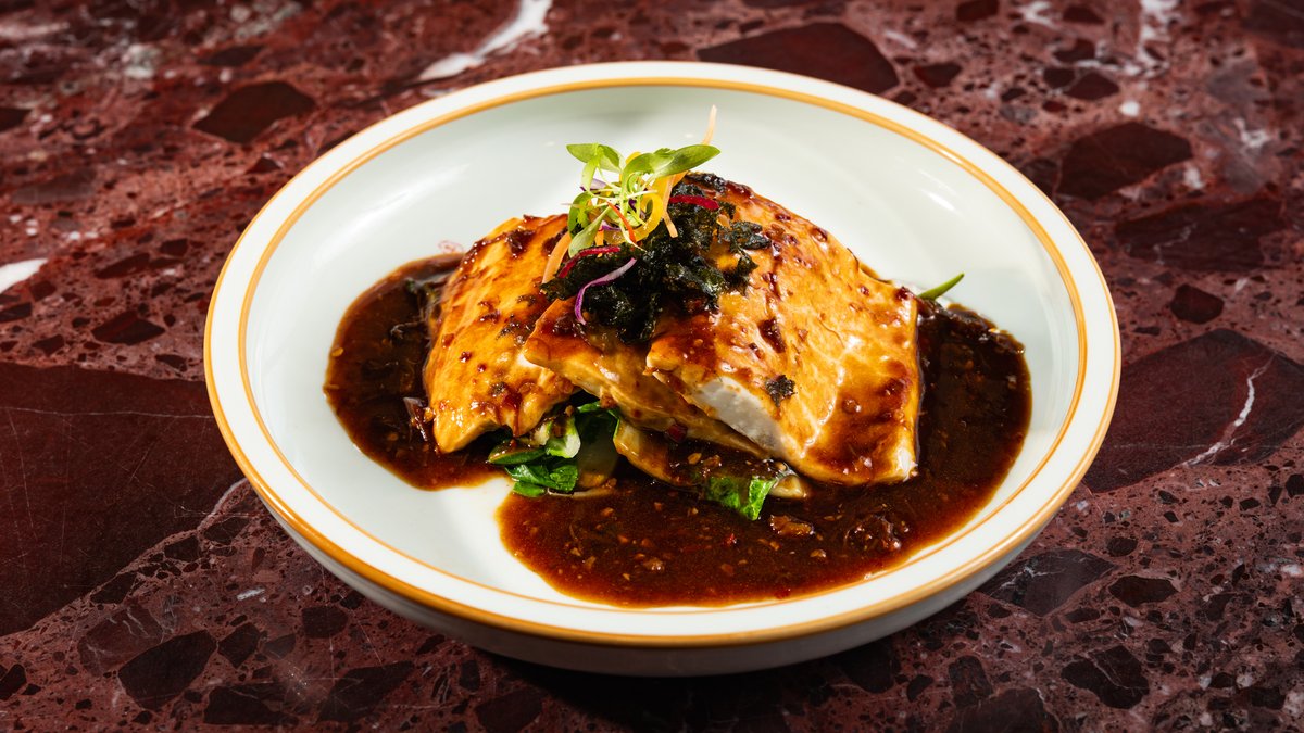 Roasted garlic chicken, jasmine tea sauce, crispy jasmine tea, spring onion silk, red chili silk