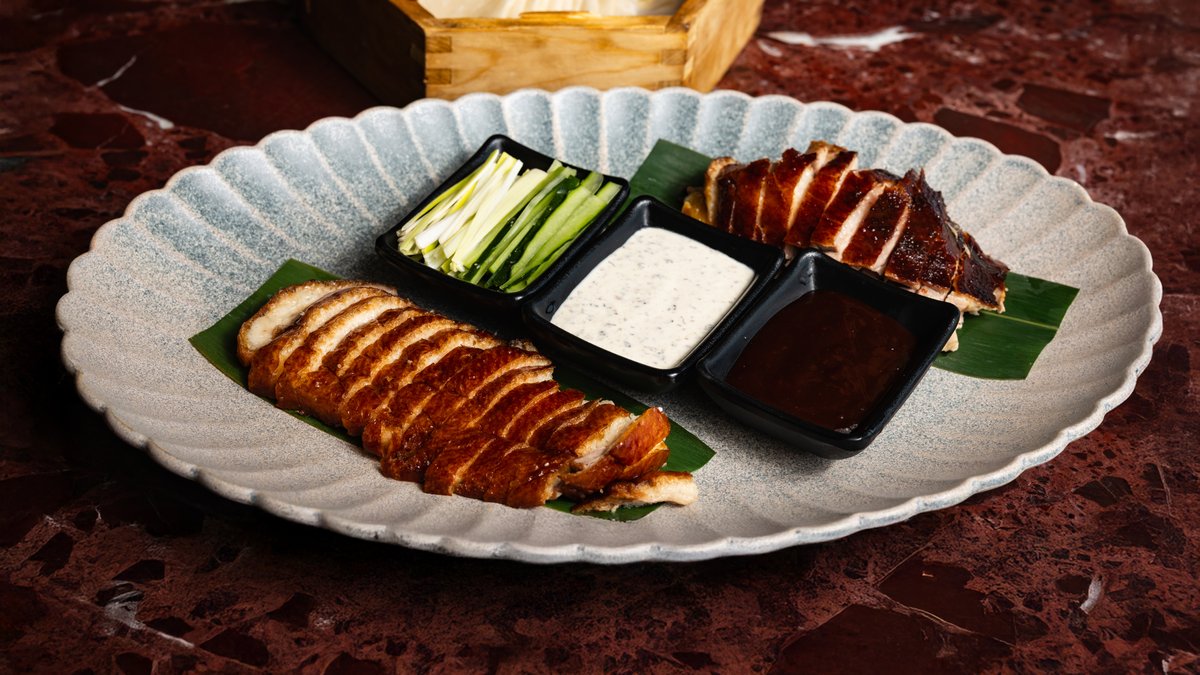 Crispy peking duck, pan cake, truffle foie gras sauce, leek, cucumber, carrot, hoisin sauce, spring onion