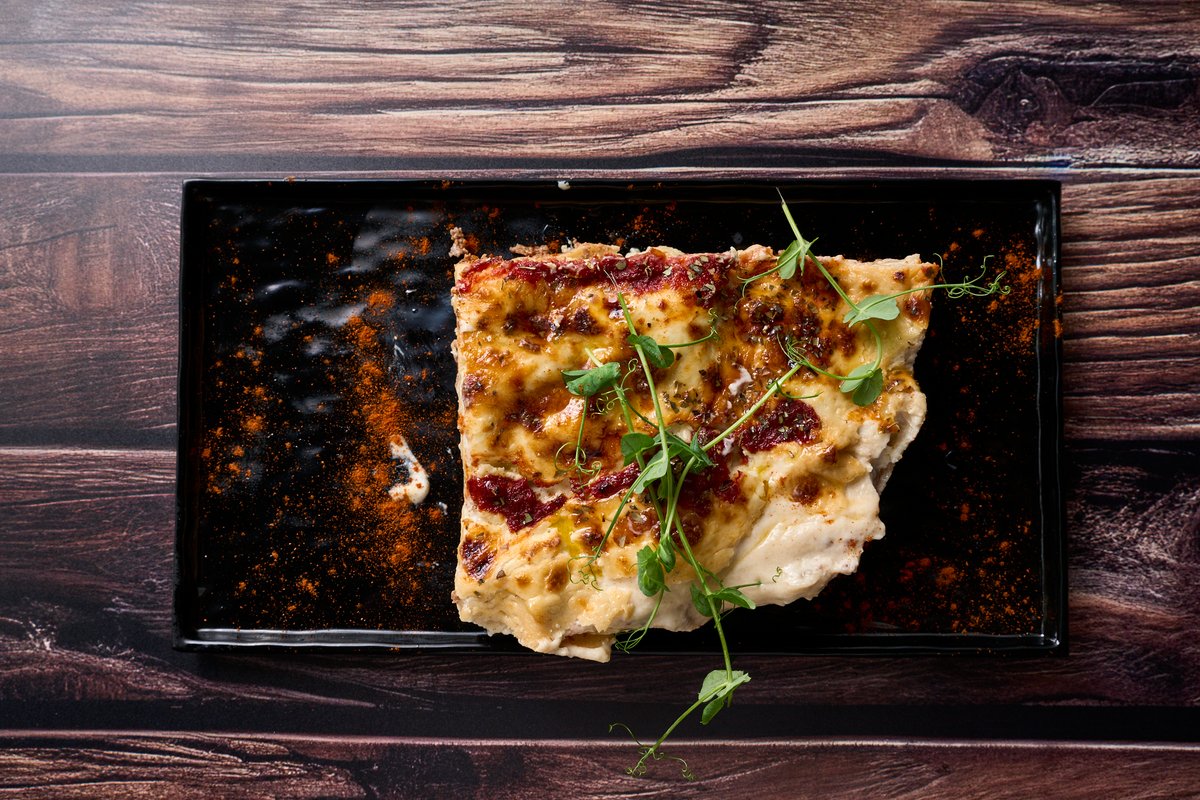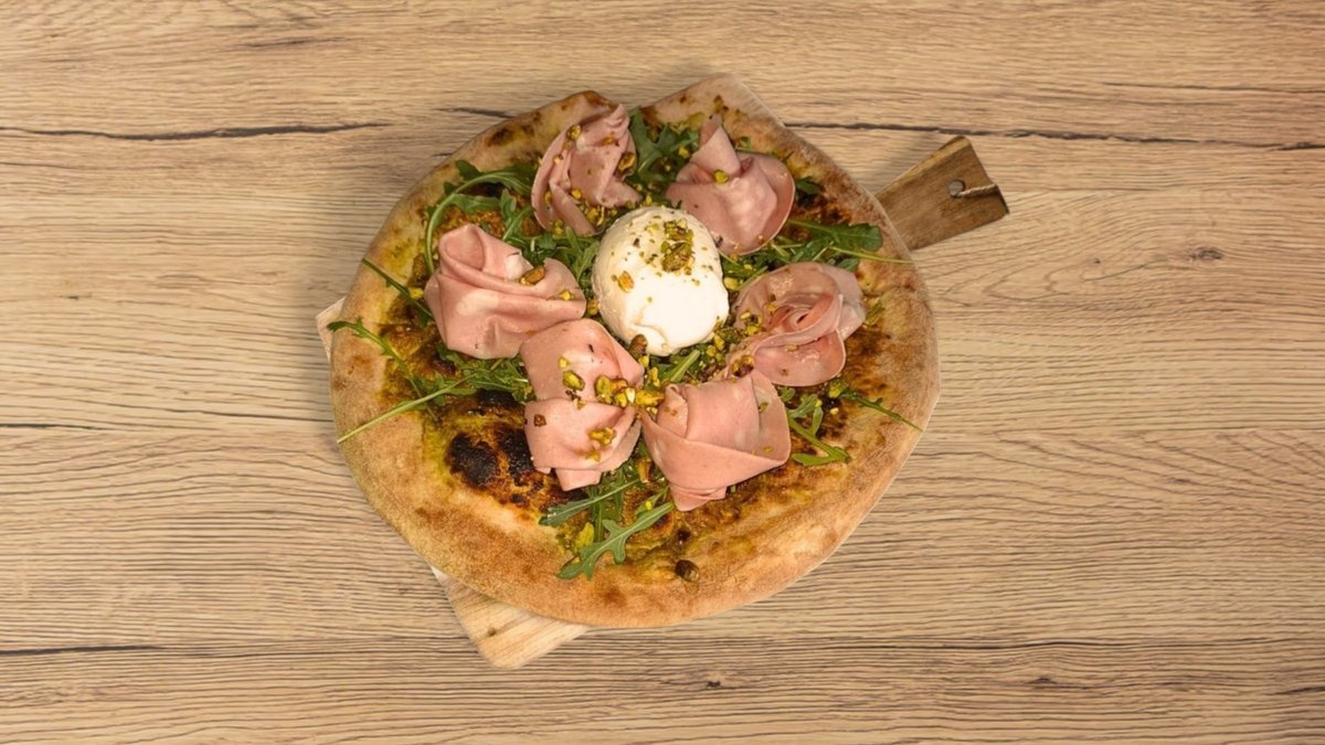 Pizza base topped with an in house pistachio base, slices of fresh mozzarella di buffalo, topped with fresh rucola and thin slices of the finest mortadella, finished off with crumbled pistachio nuts and with a drizzle of extra virgin olive oil