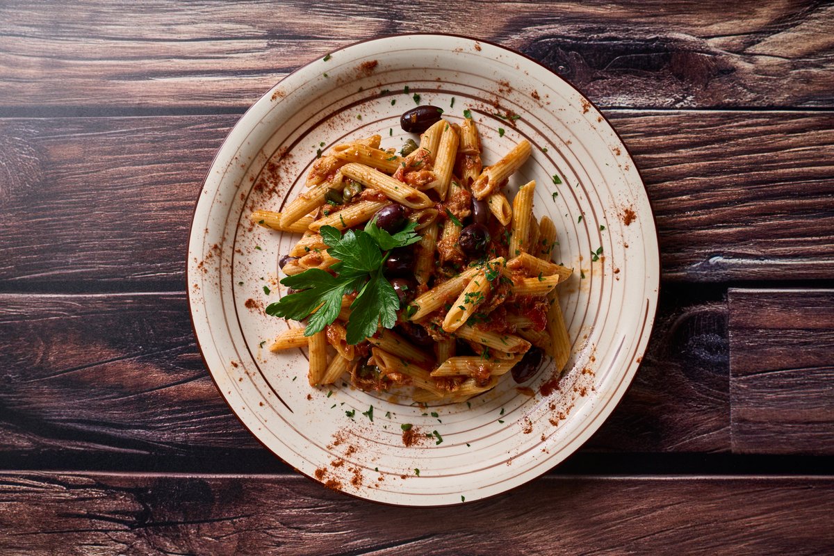 Sauteed onion garlic and capers tuna flakes, calamata pitted black olives in a rich tomato sauce