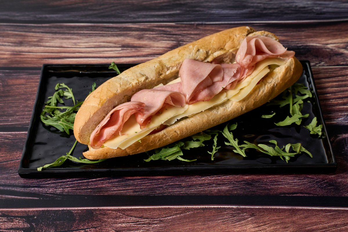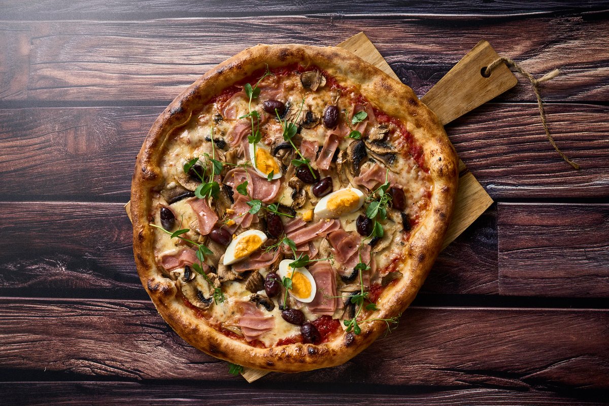 Pizza base topped with a rich tomato sauce shredded mozzarella, sliced ham, mushrooms, eggs, pitted black olives and finished with oregano