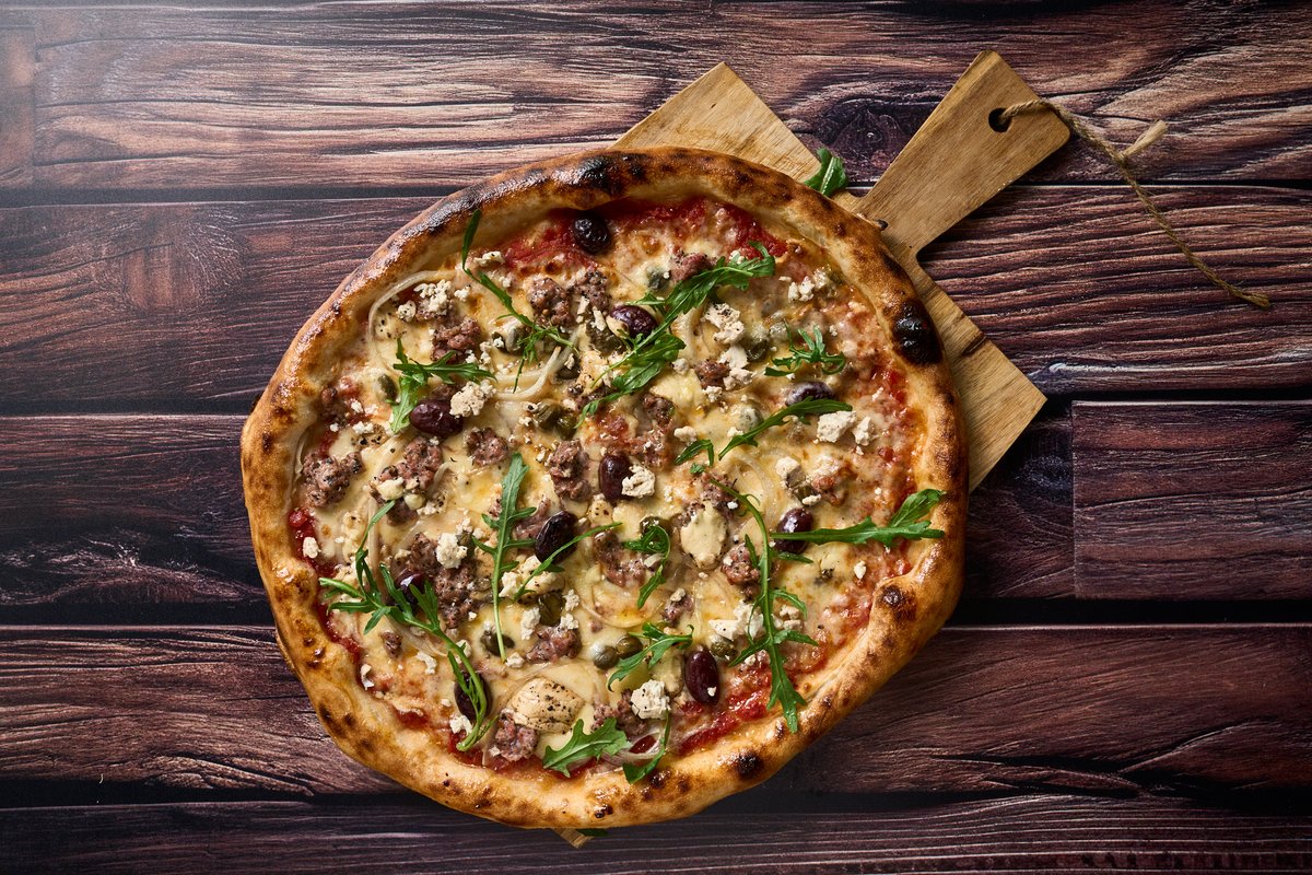 Pizza base topped with a rich tomato sauce, shredded mozzarella, garlic, peppered goats'cheese, maltese sausage, sliced onions, capers, pitted black olives