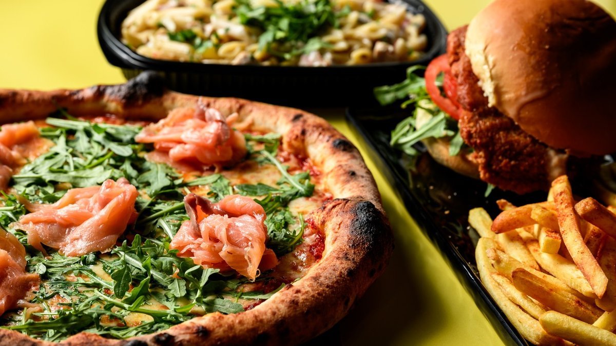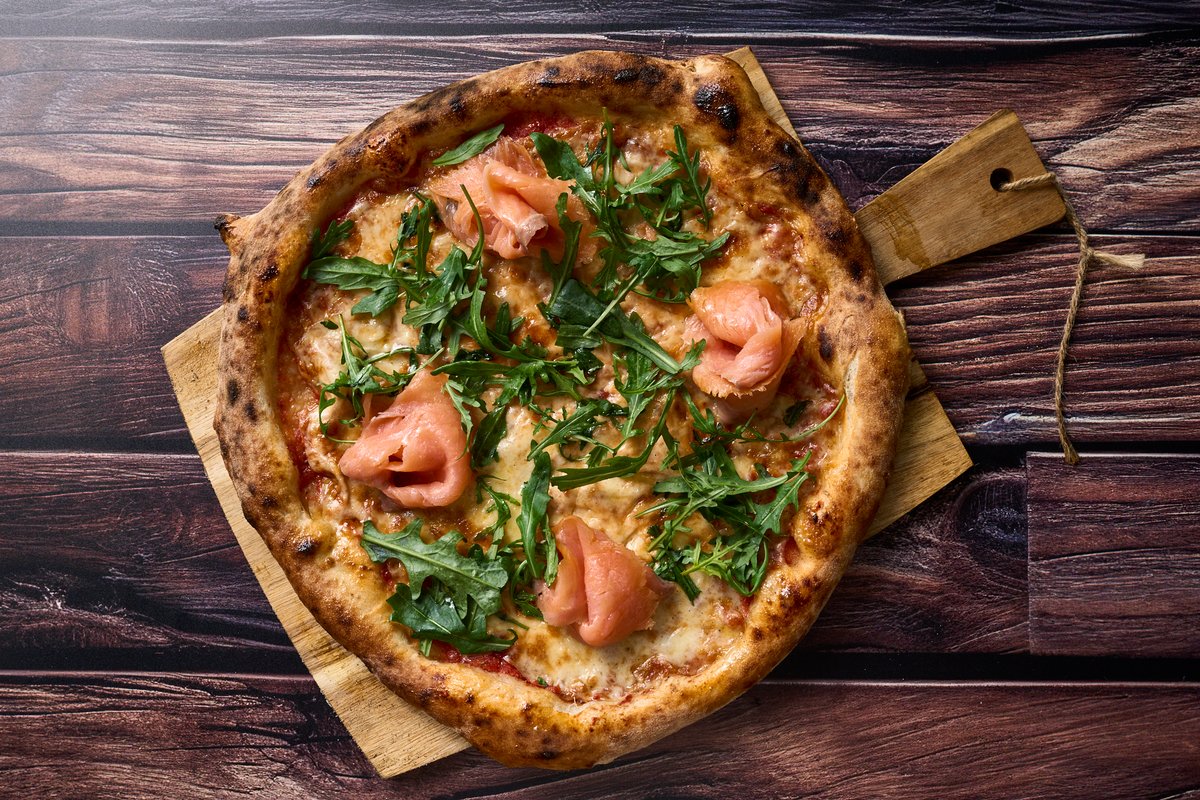 Pizza base topped with a rich tomato sauce shredded mozzarella and scottish smoked salmon. Topped off with crisp rucola