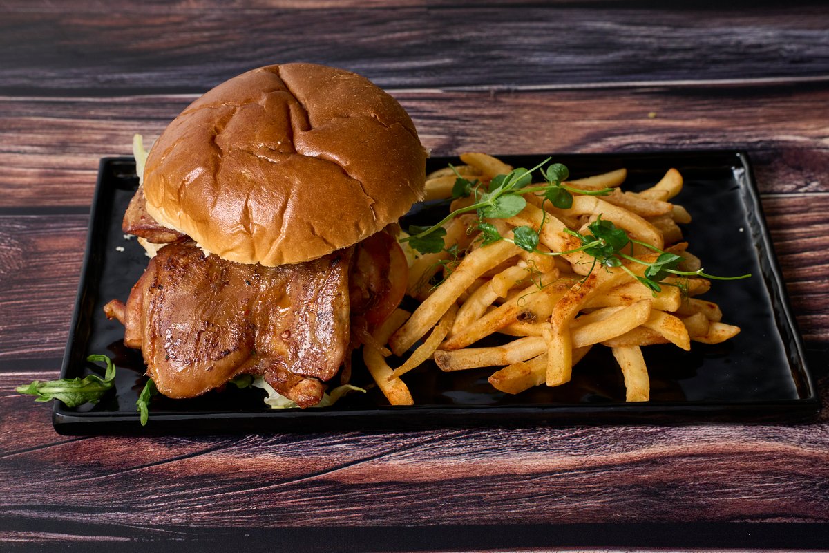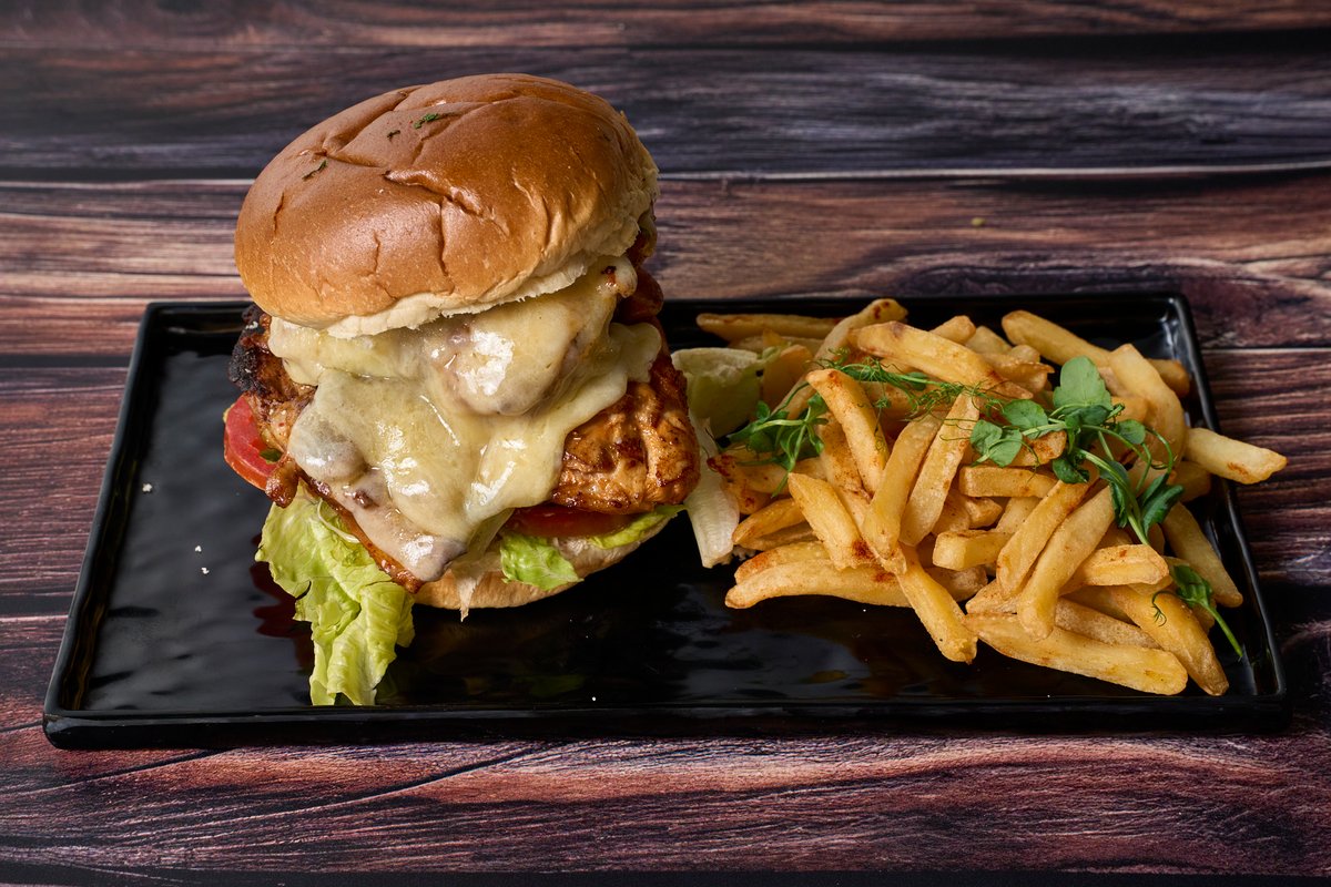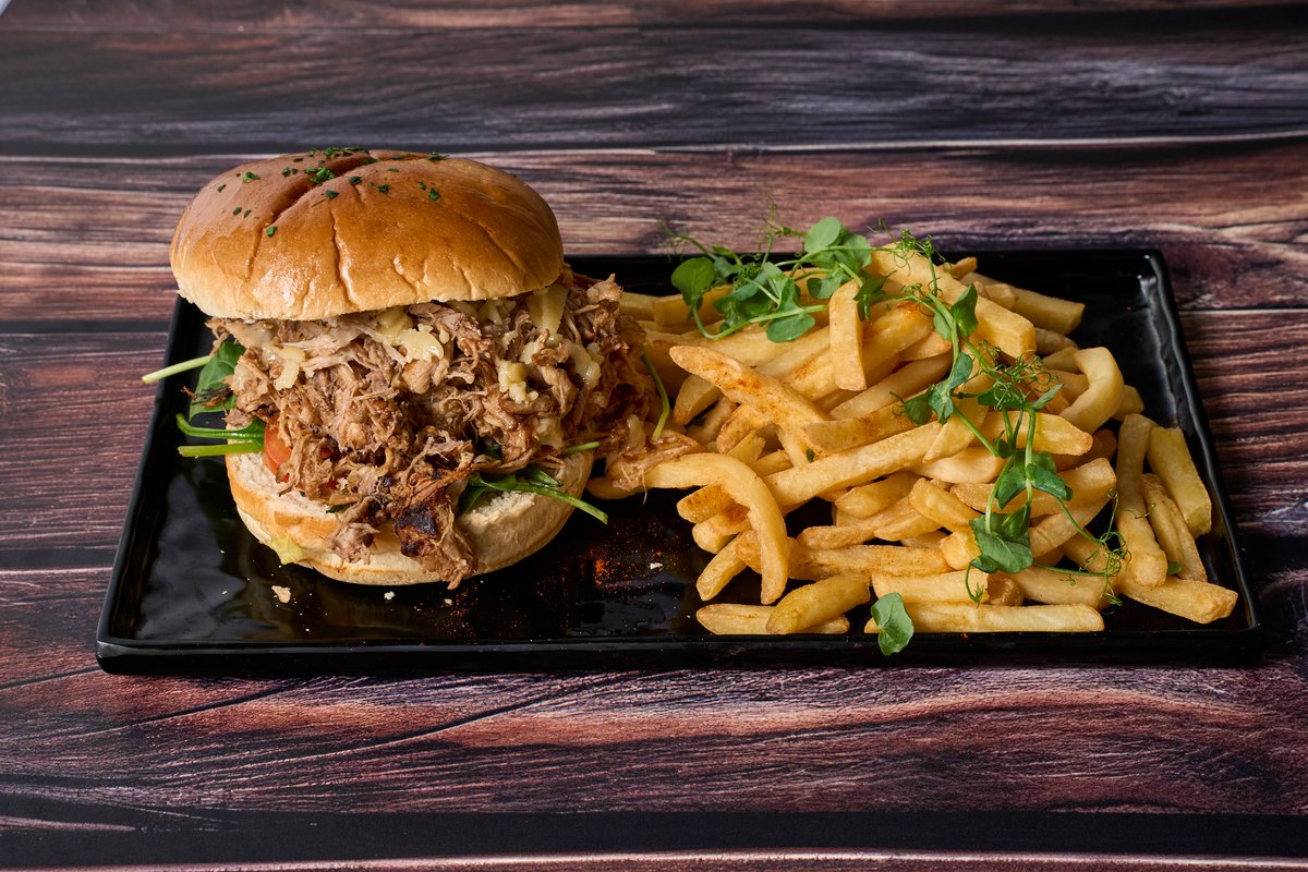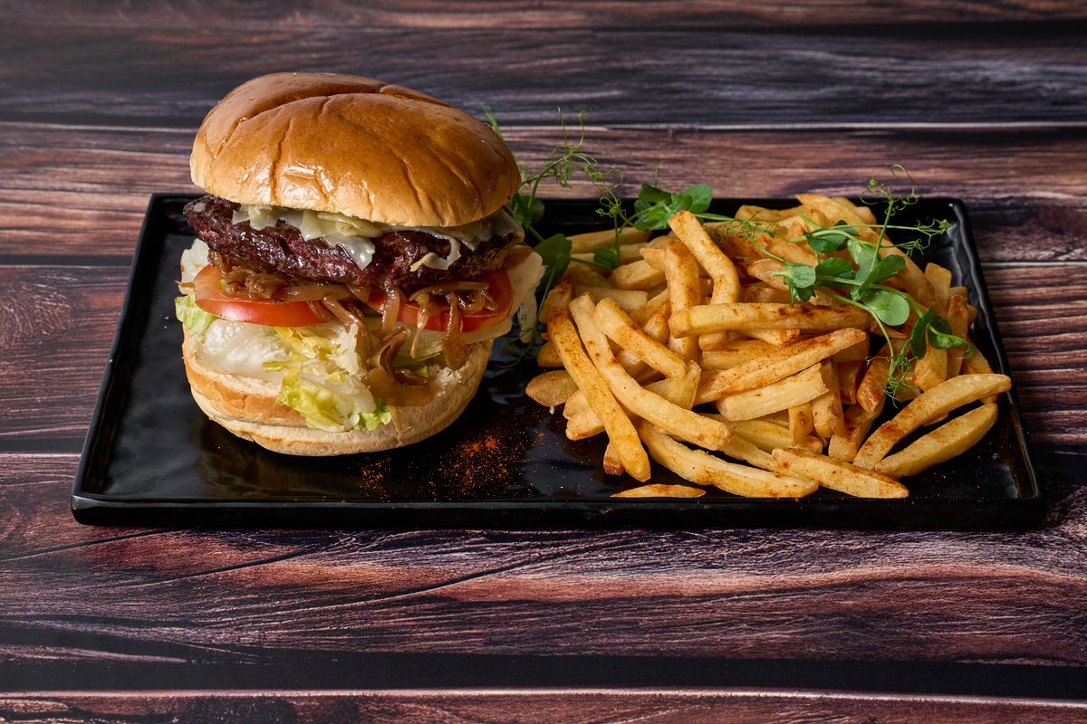 Beef patty cooked to perfection, melted mature cheddar cheese. Served on a brioche bun crisp lettuce and sliced tomatoes with a caramelized onion jam and fries