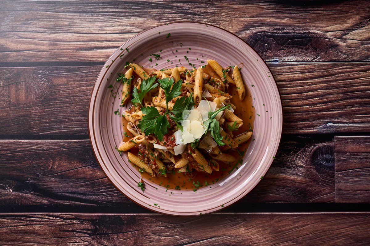 Ground mince beef cooked in a rich tomato sauce with onions, garlic, carrots. Finished of with fresh herbs and topped with crisp rucola and grana shavings