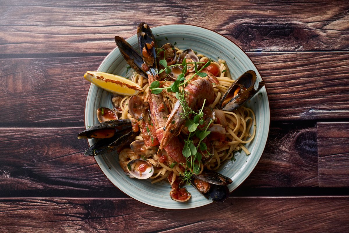 A selection of shellfish black shell mussels, vongole, king prawns sautéed in garlic, reduced in a lobster bisque and white wine and lemon juice finished off with fresh herbs