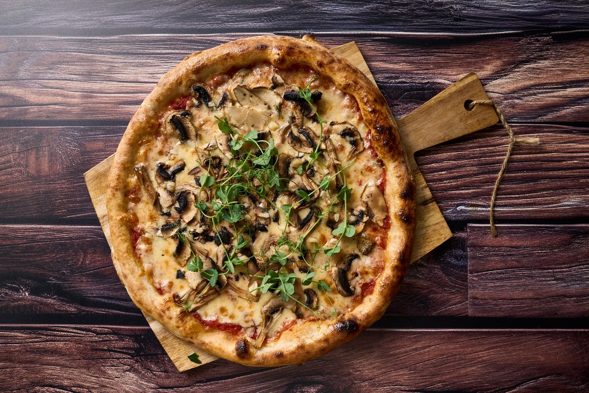 Pizza base topped with a rich tomato sauce, shredded mozzarella, sliced mushrooms, chopped garlic, and finished off with oregano
