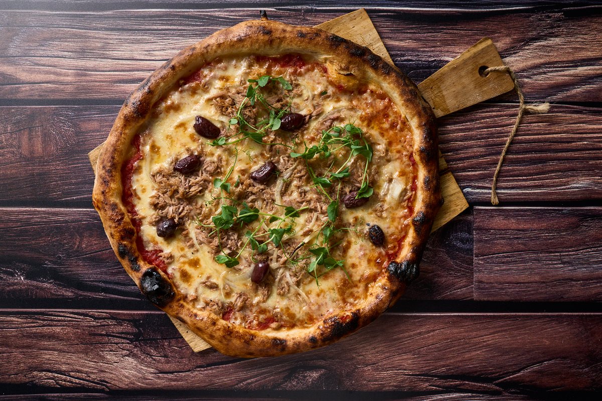 Pizza base topped with rich tomato sauce, shredded mozzarella, sliced onions, tuna flakes, finished off with pitted black olives