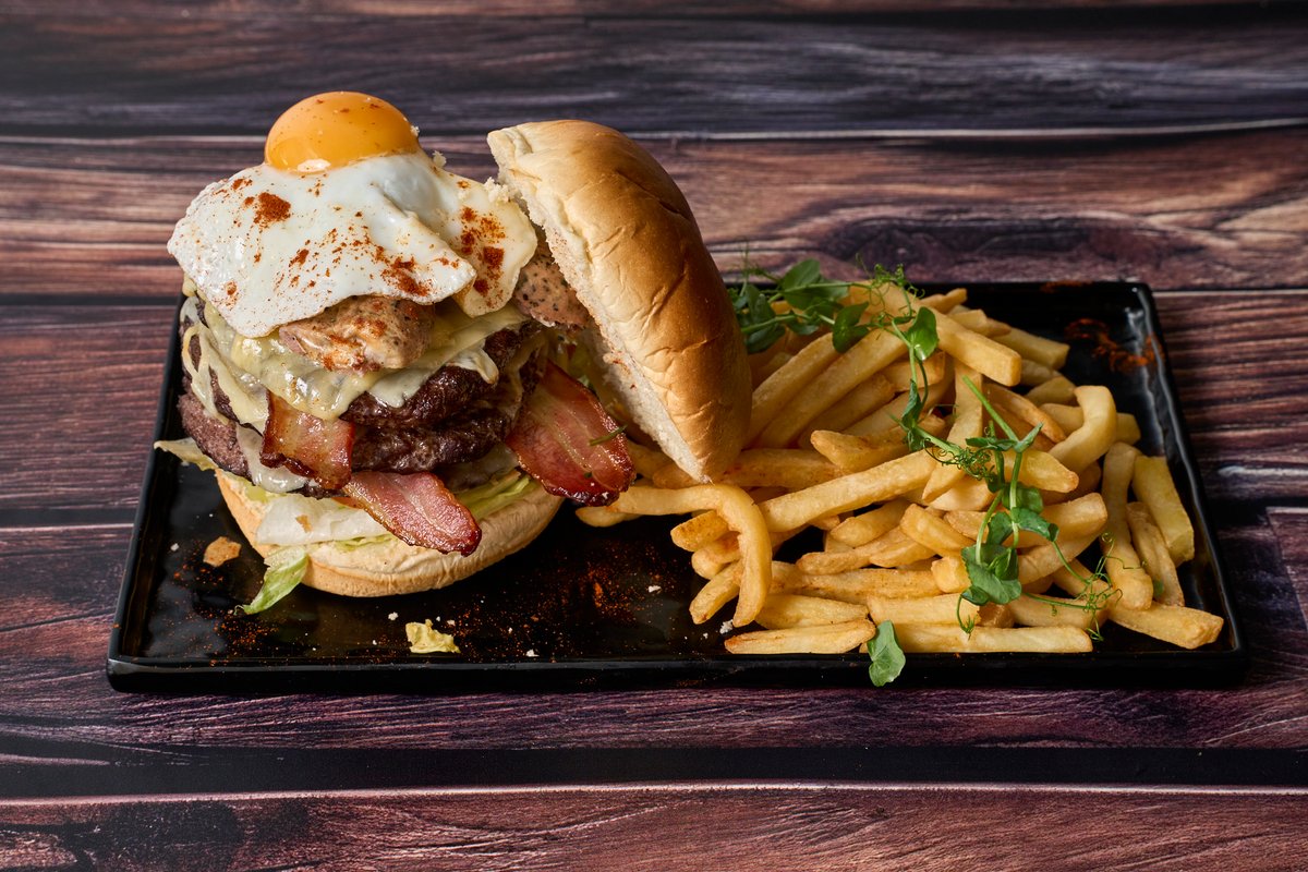 Three succulent beef patties cooked to perfection, with melted mature cheddar bacon maltese sausage. Sunny side up fried egg and caramelized onion jam. Served on a brioche bun and fries, not for the weak hearted