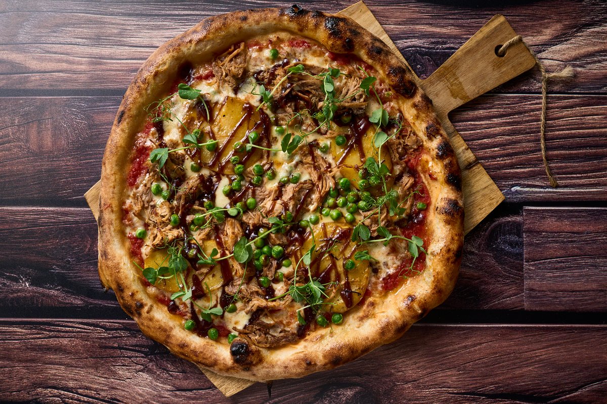 Pizza base with baebecue sauce topped with pulled pork. Mozzarella, sliced roasted potatoes, peas