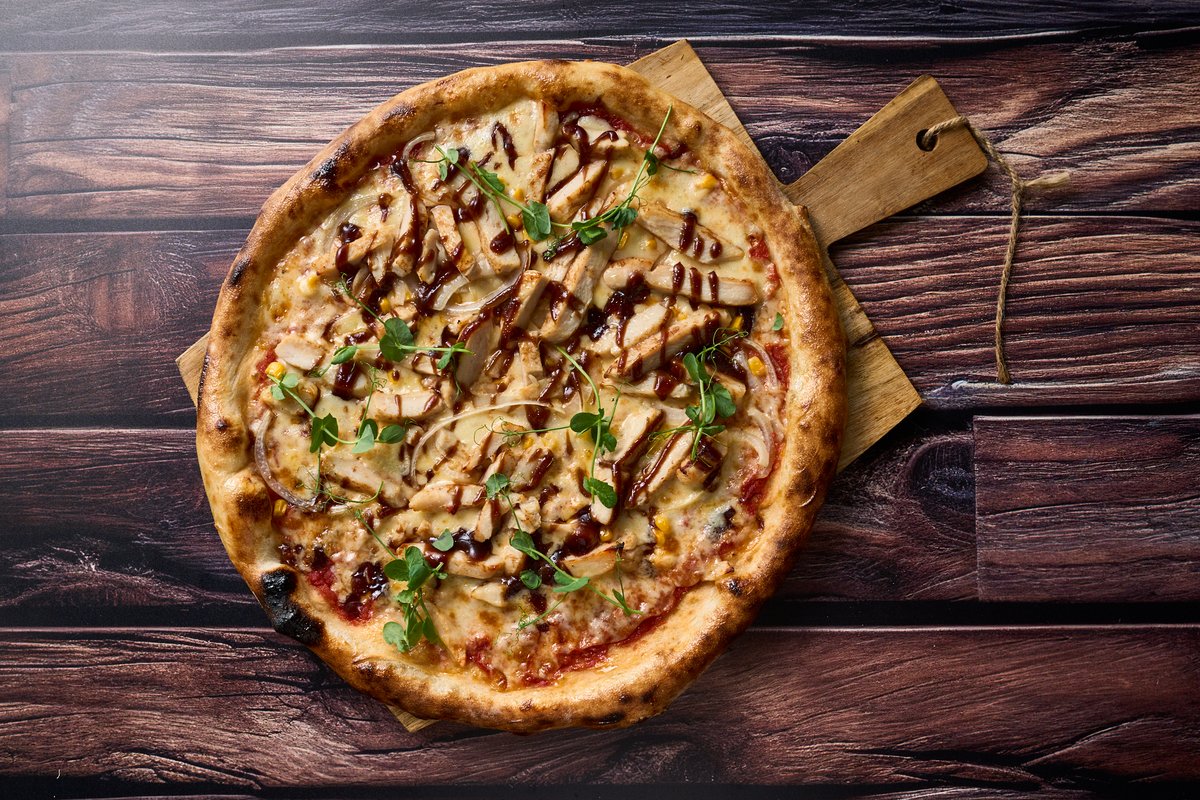 Pizza base topped pesto sauce, shredded mozzarella, sliced onions, sweet corn, chicken, and barbecue sauce