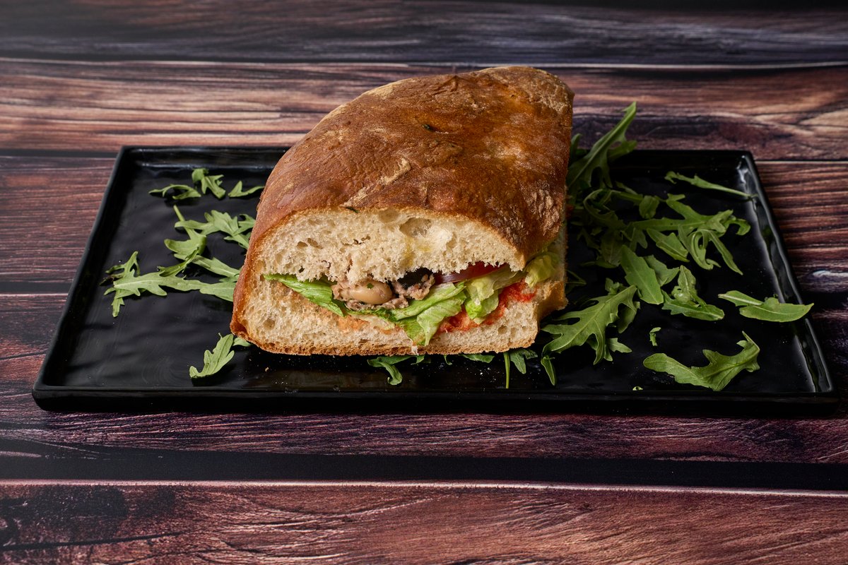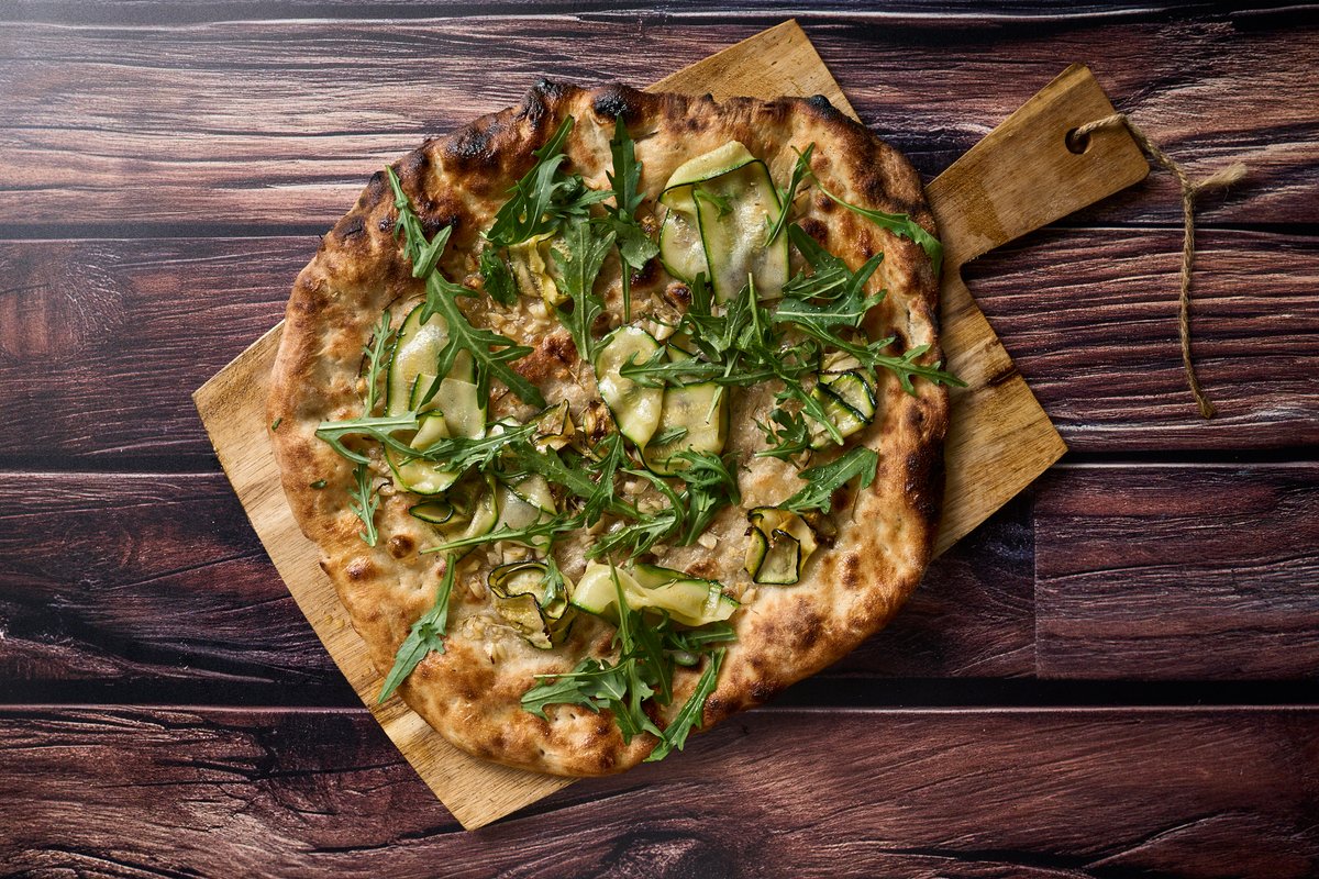 Italian style focaccia with crushed garlic, cracked rock salt, rosemary, zucchini ribbons, cooked until golden brown finished off with crisp rucola and a lemon olive oil