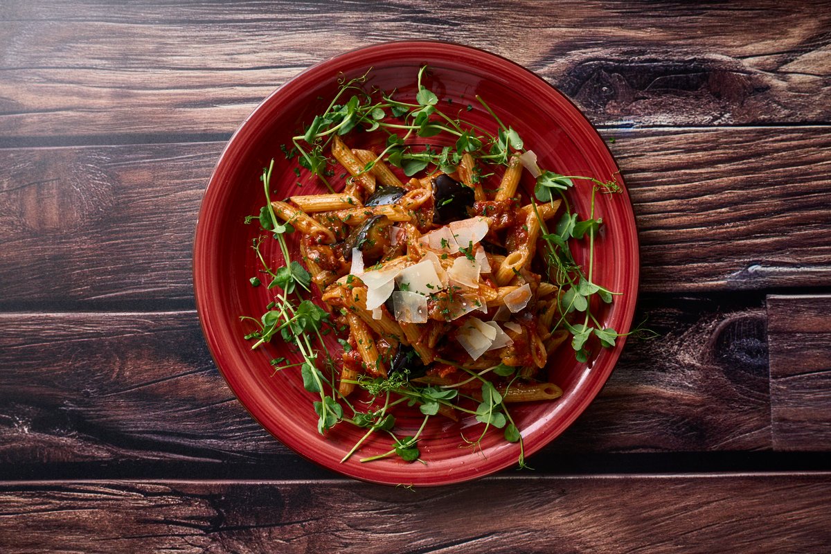 Sauteed diced aubergines with garlic a dash of white wine finished off with a rich tomato sauce topped off with grana shavings