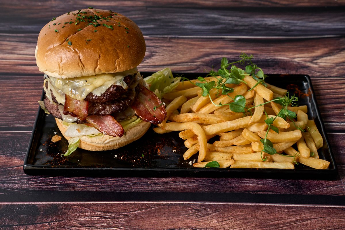 Three beef patties with cheese and bacon between each layer served in a brioche bun with crisp lettuce sliced tomatoes and raw onion and fries