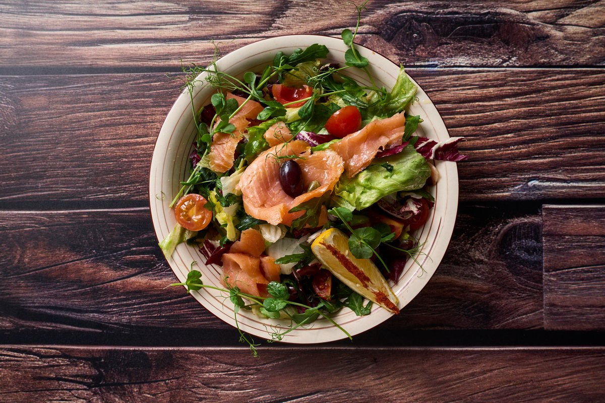 Mixed salad leaves, capers, cherry tomatoes calamata pitted black olives, smoked salmon, lemon wedge dressed with balsamic vinegar extra virgin olive oil